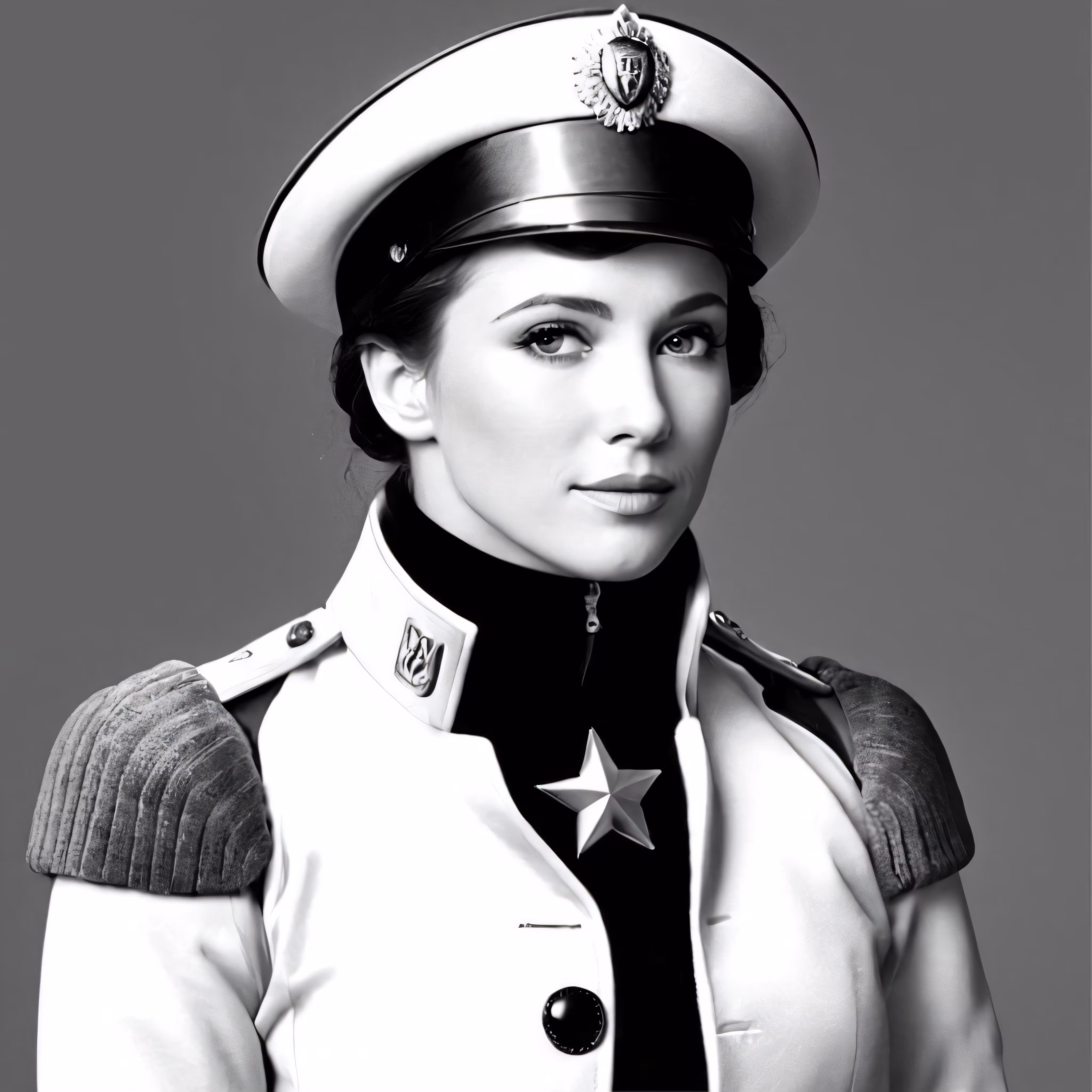 High resolution picture, free to use, a woman in military clothing poses for a black and white photo