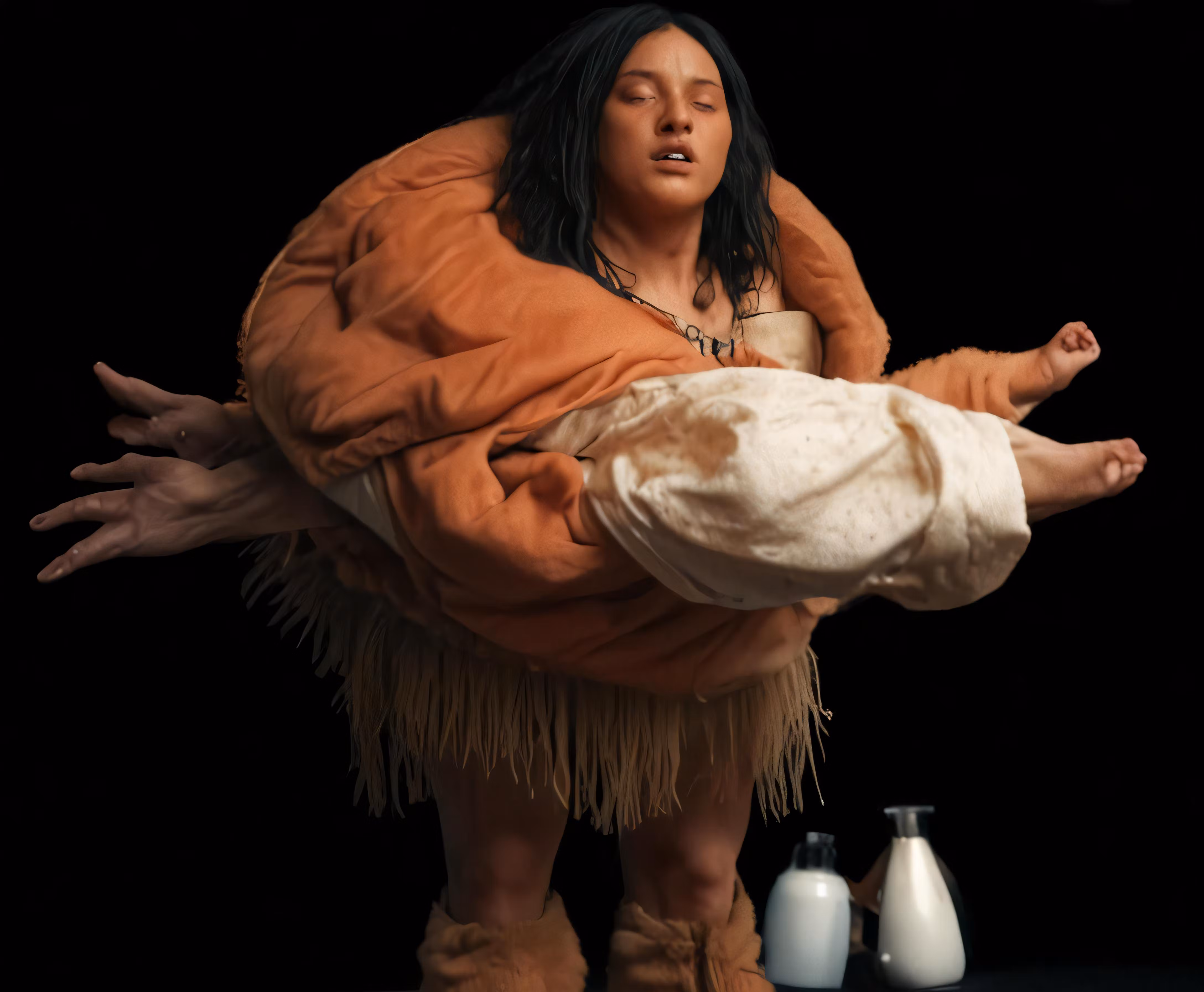 High resolution picture, free to use, a woman in native dress standing behind jugs
