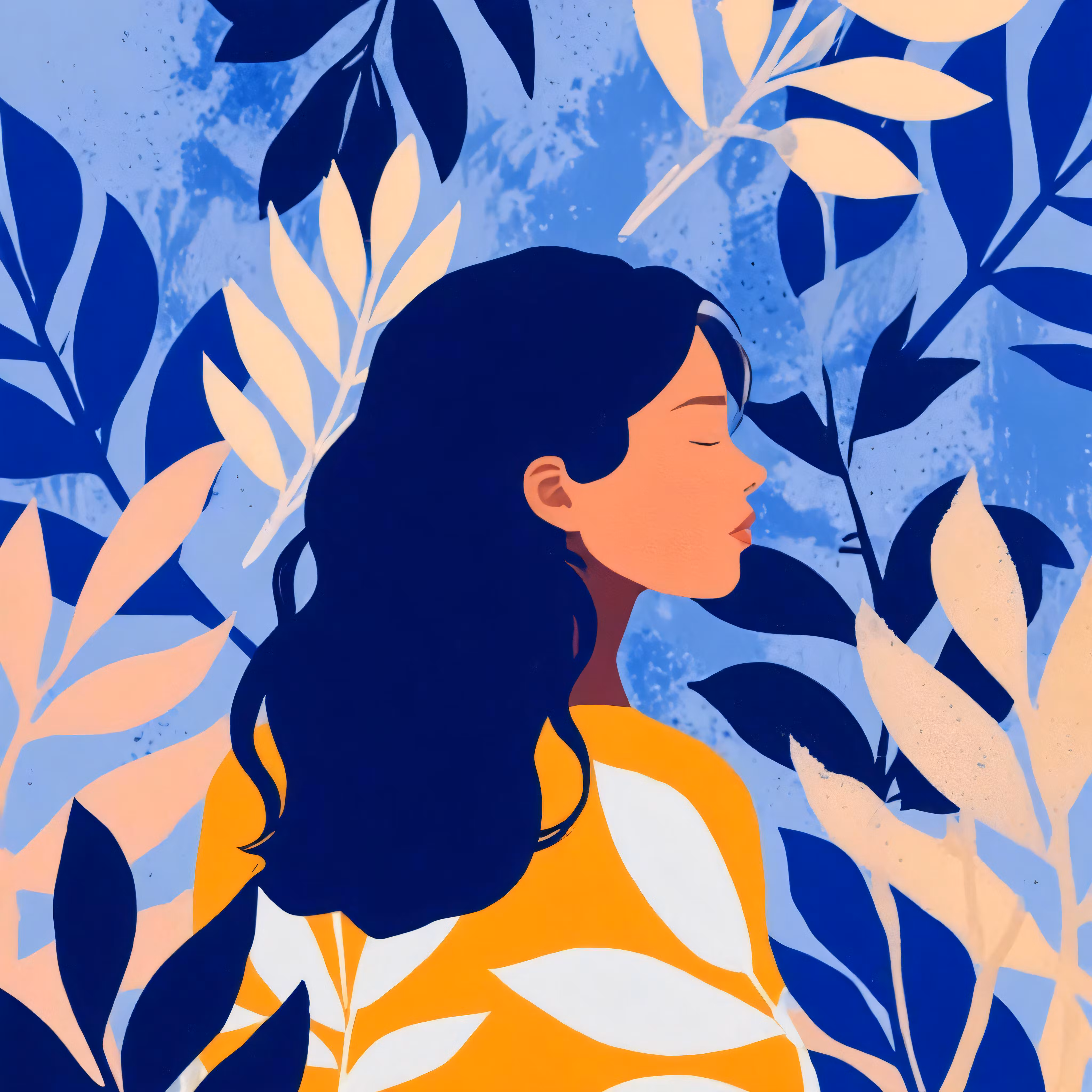 High resolution picture, free to use, a woman in orange with leaves on her shoulder