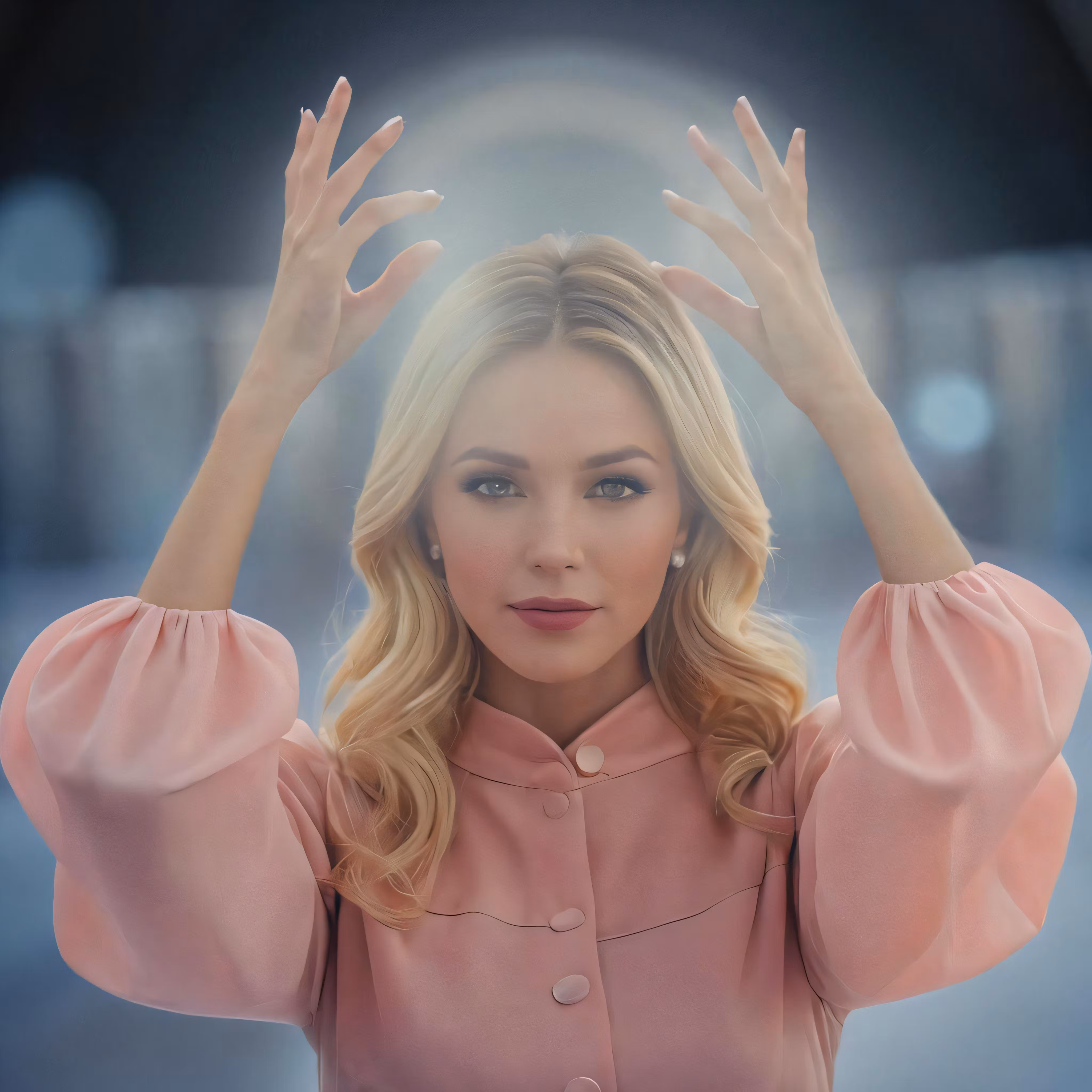 High resolution picture, free to use, a woman in pink shirt holding her hands up
