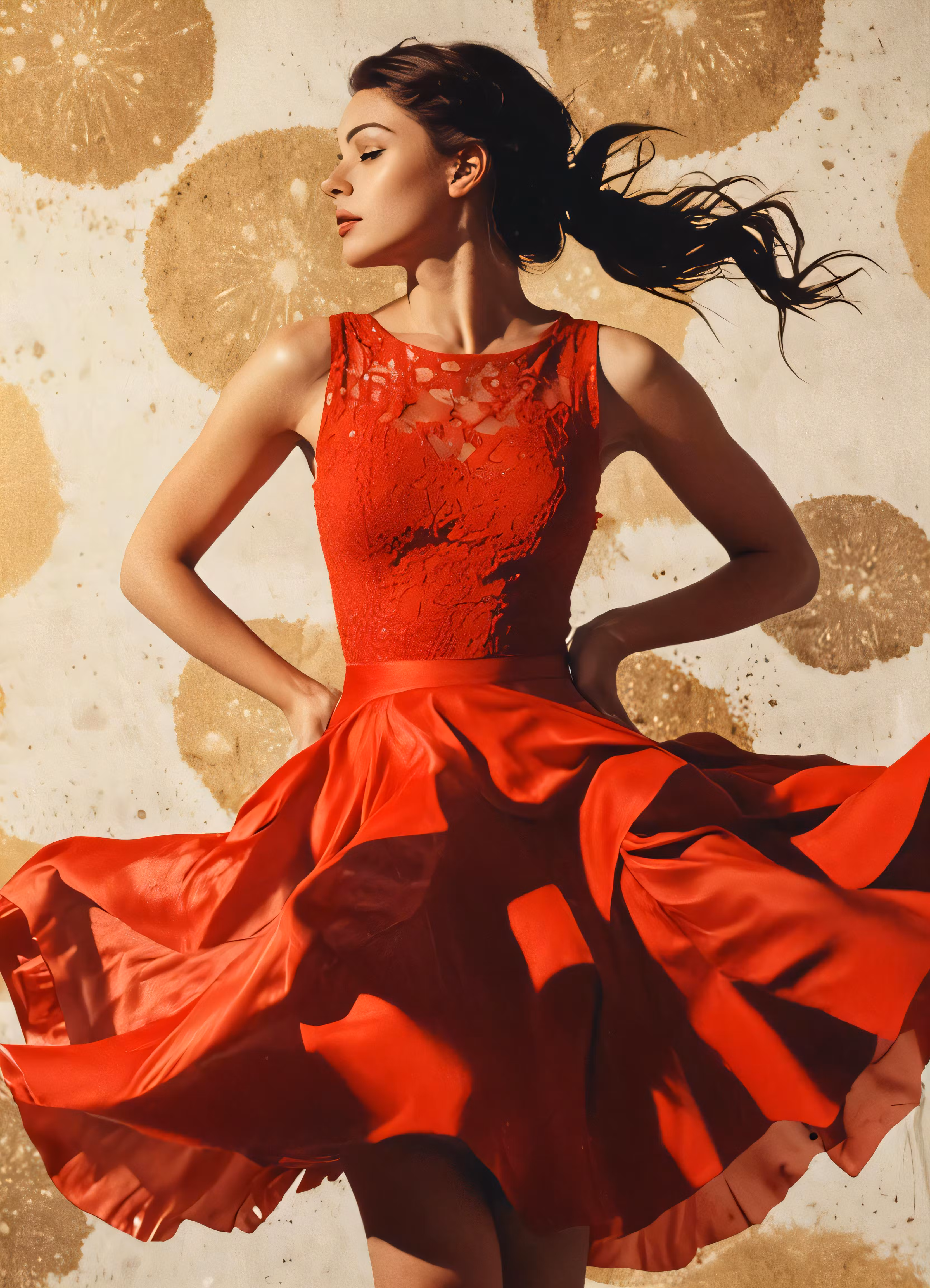High resolution picture, free to use, a woman in red dress in front of a wall