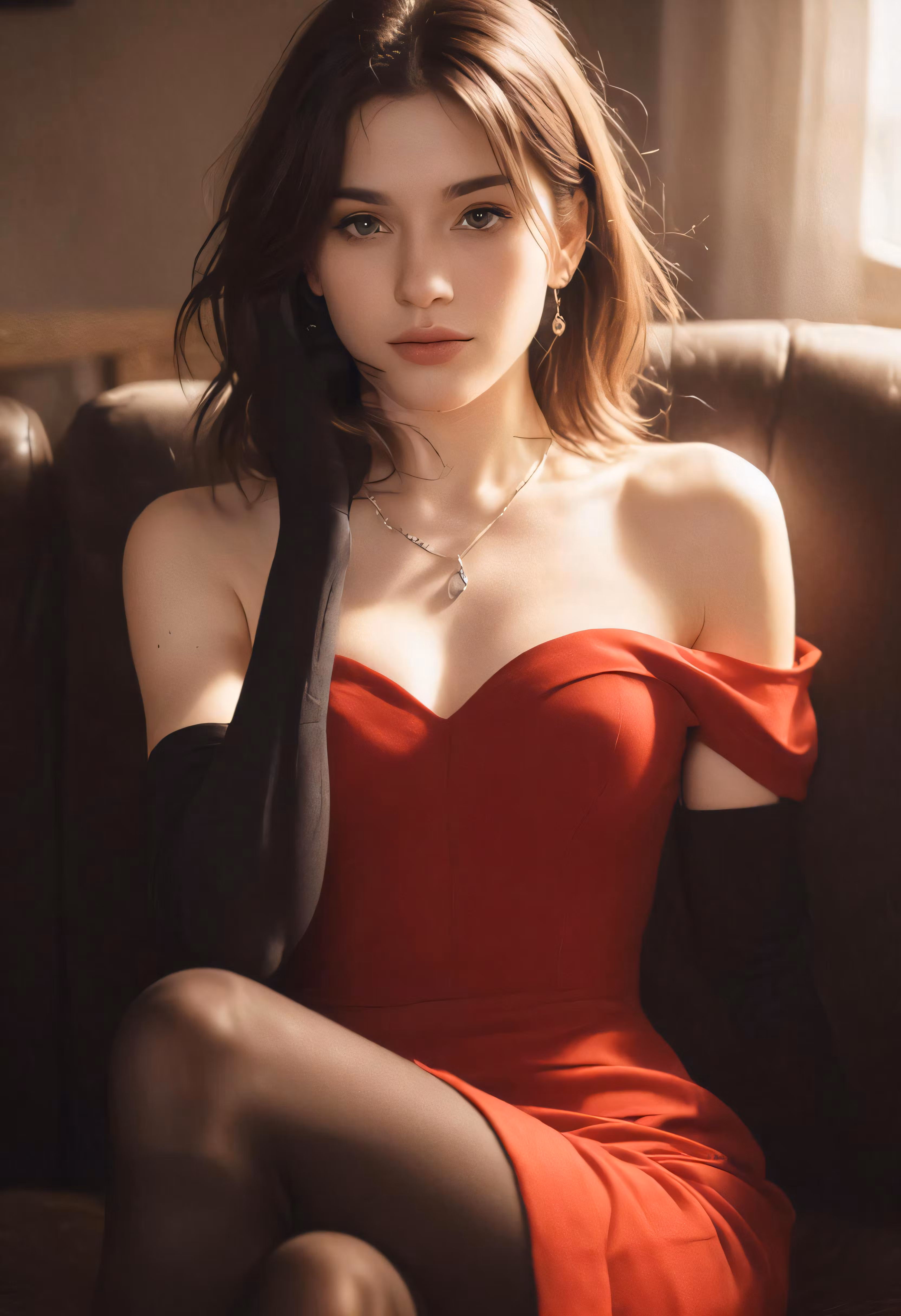 High resolution picture, free to use, a woman in red is sitting on the couch