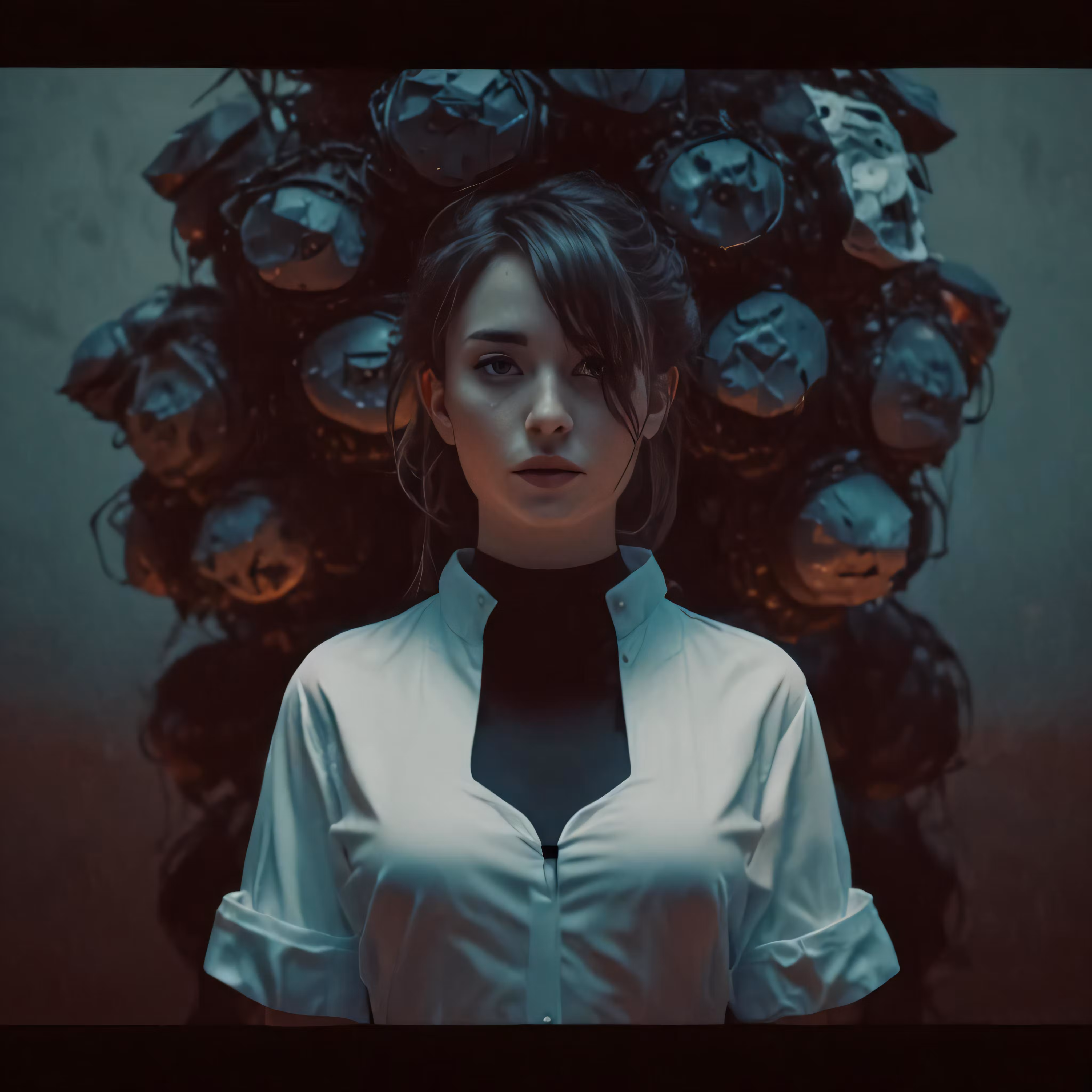 High resolution picture, free to use, a woman in shirt and black neck tie standing next to a large sculpture