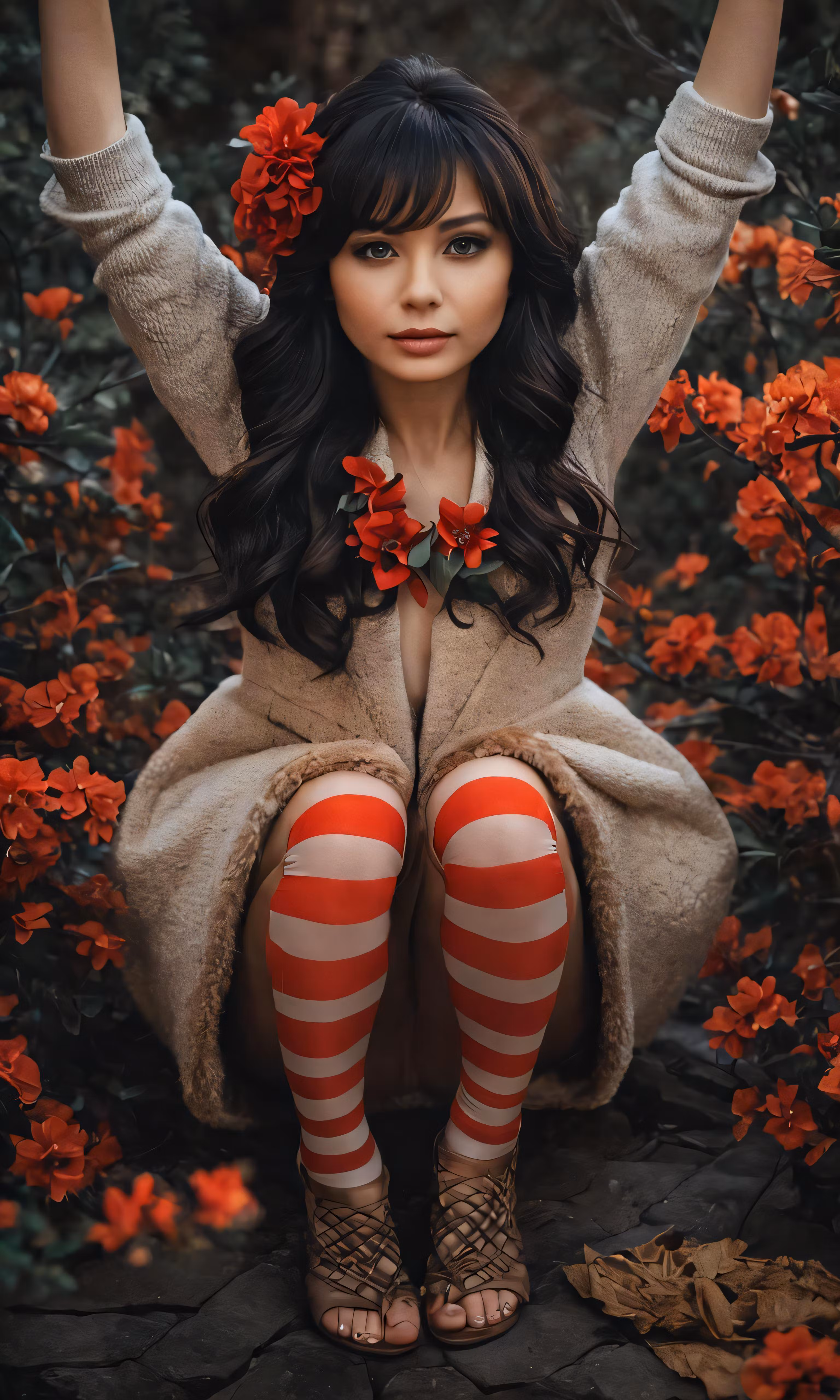High resolution picture, free to use, a woman in striped stockings sits in front of flowers with her hands up in the air