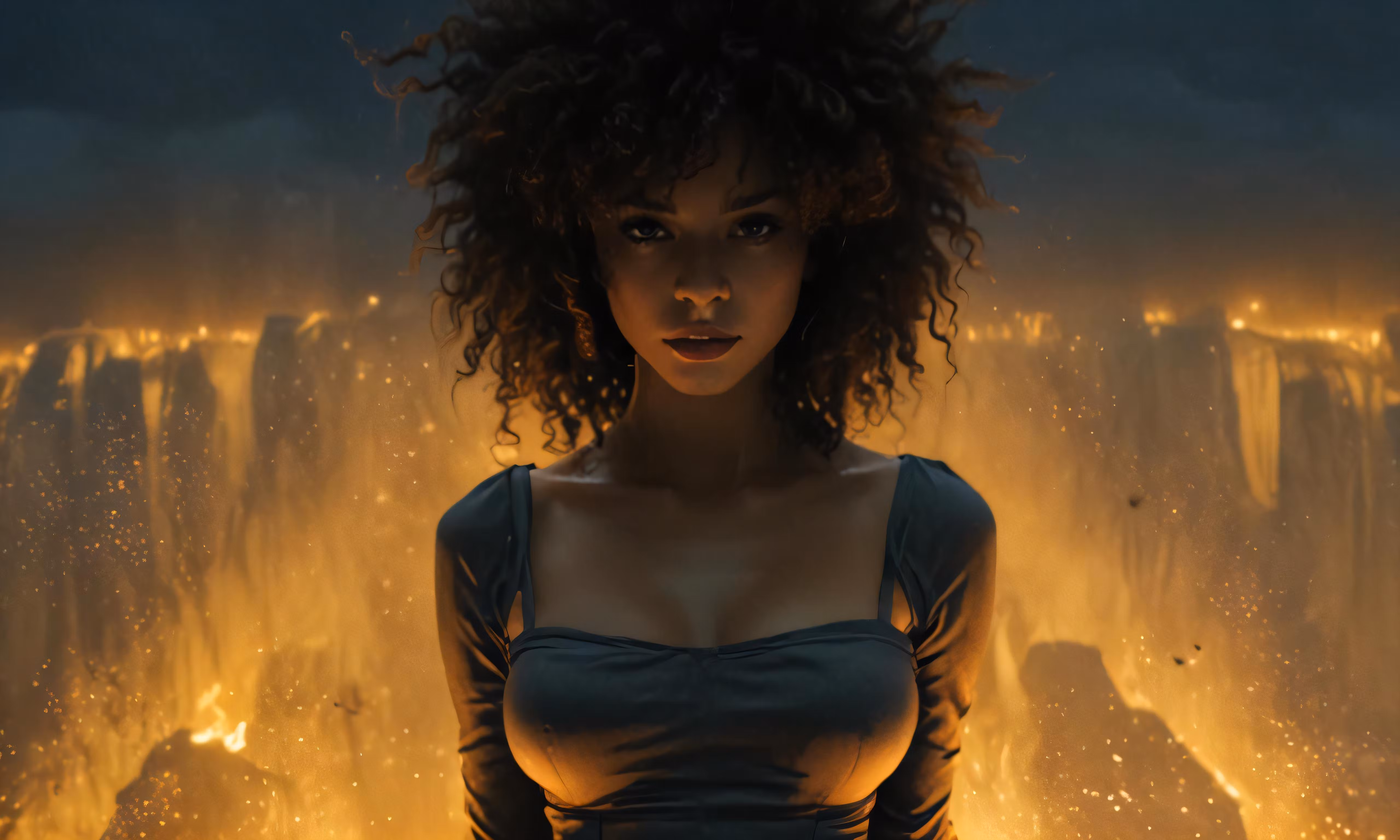 High resolution picture, free to use, a woman in the midst of fire with an exploding head