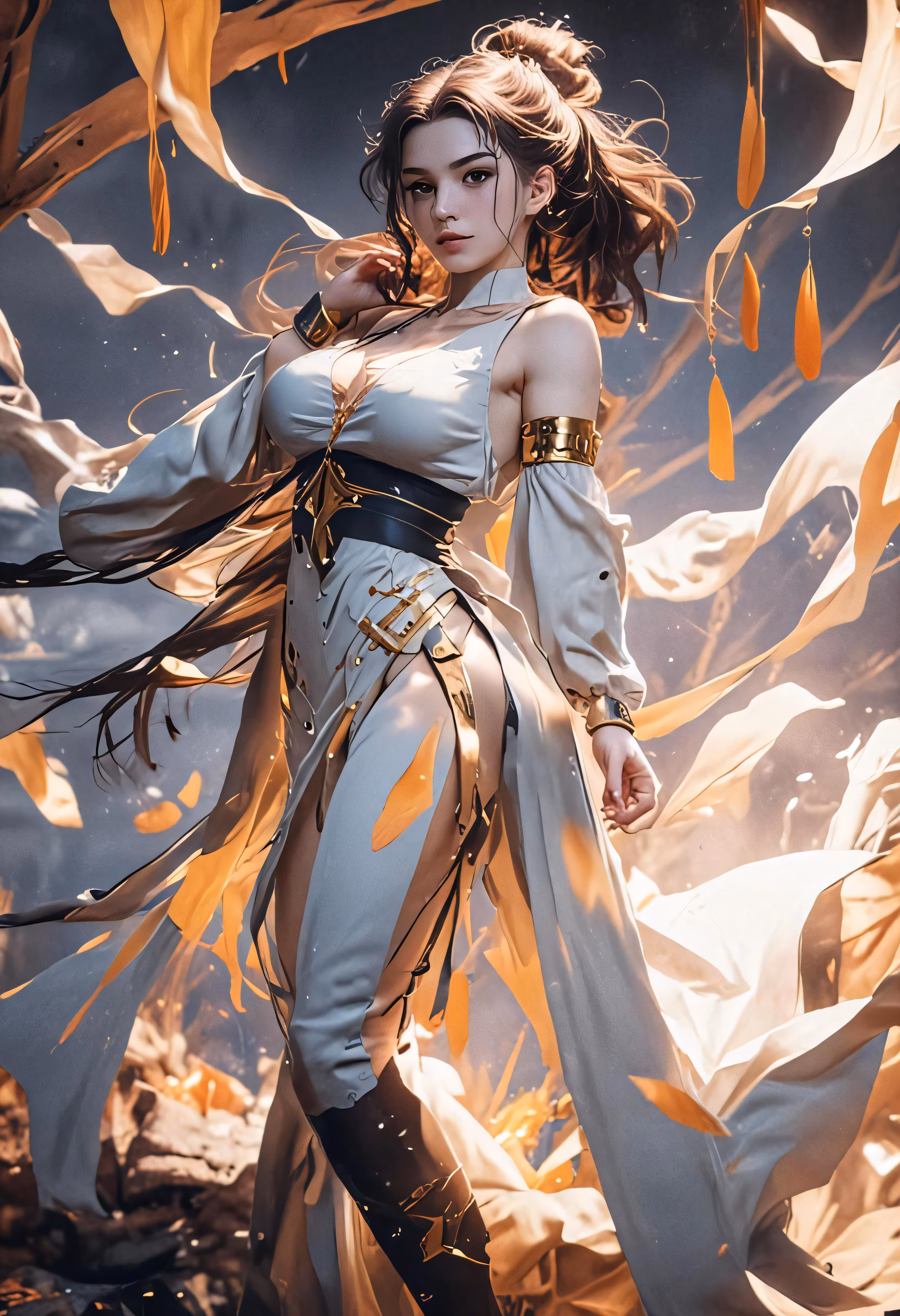 High resolution picture, free to use, a woman in white and gold attire standing near a tree