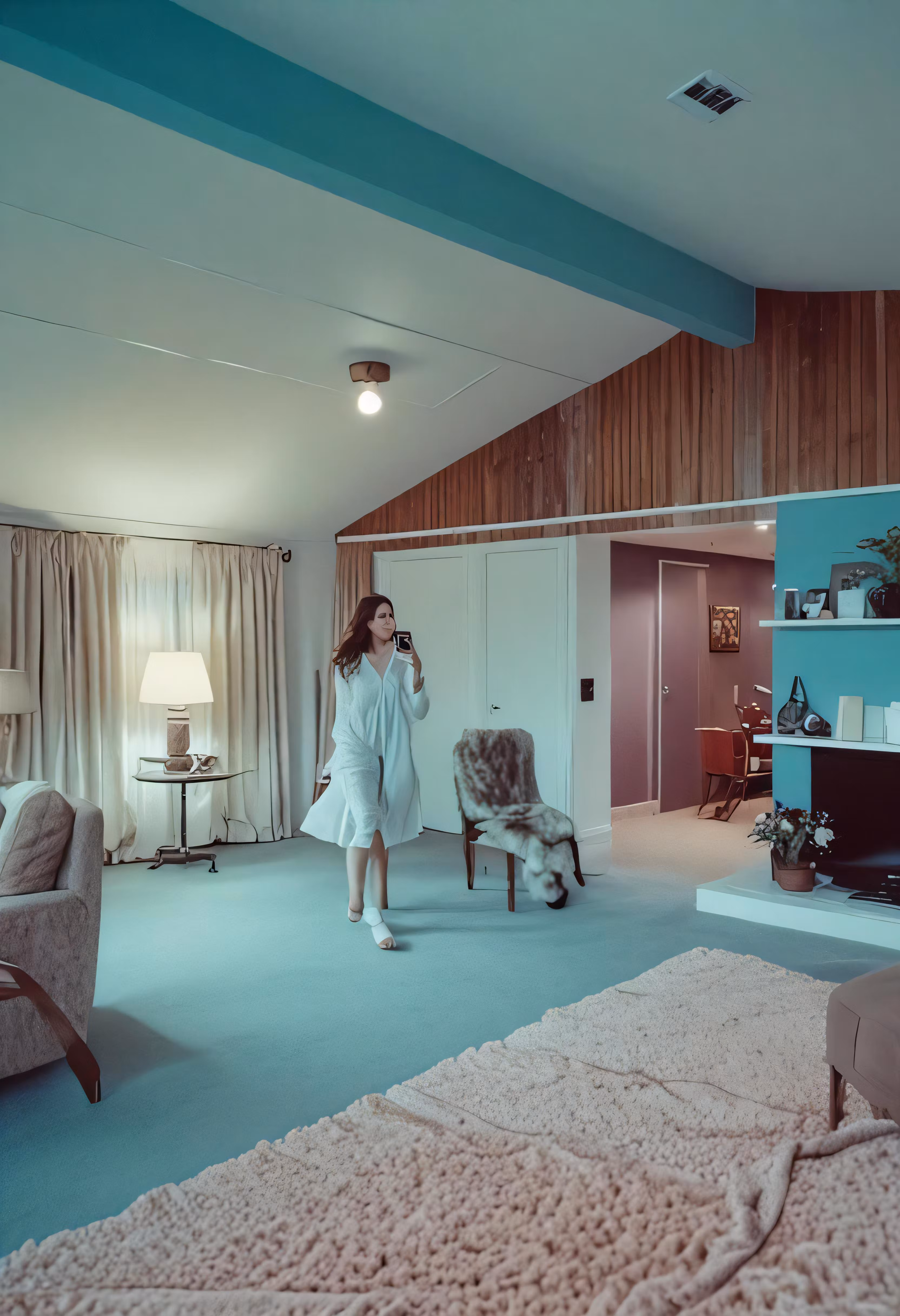 High resolution picture, free to use, a woman in white dress standing inside of a living room