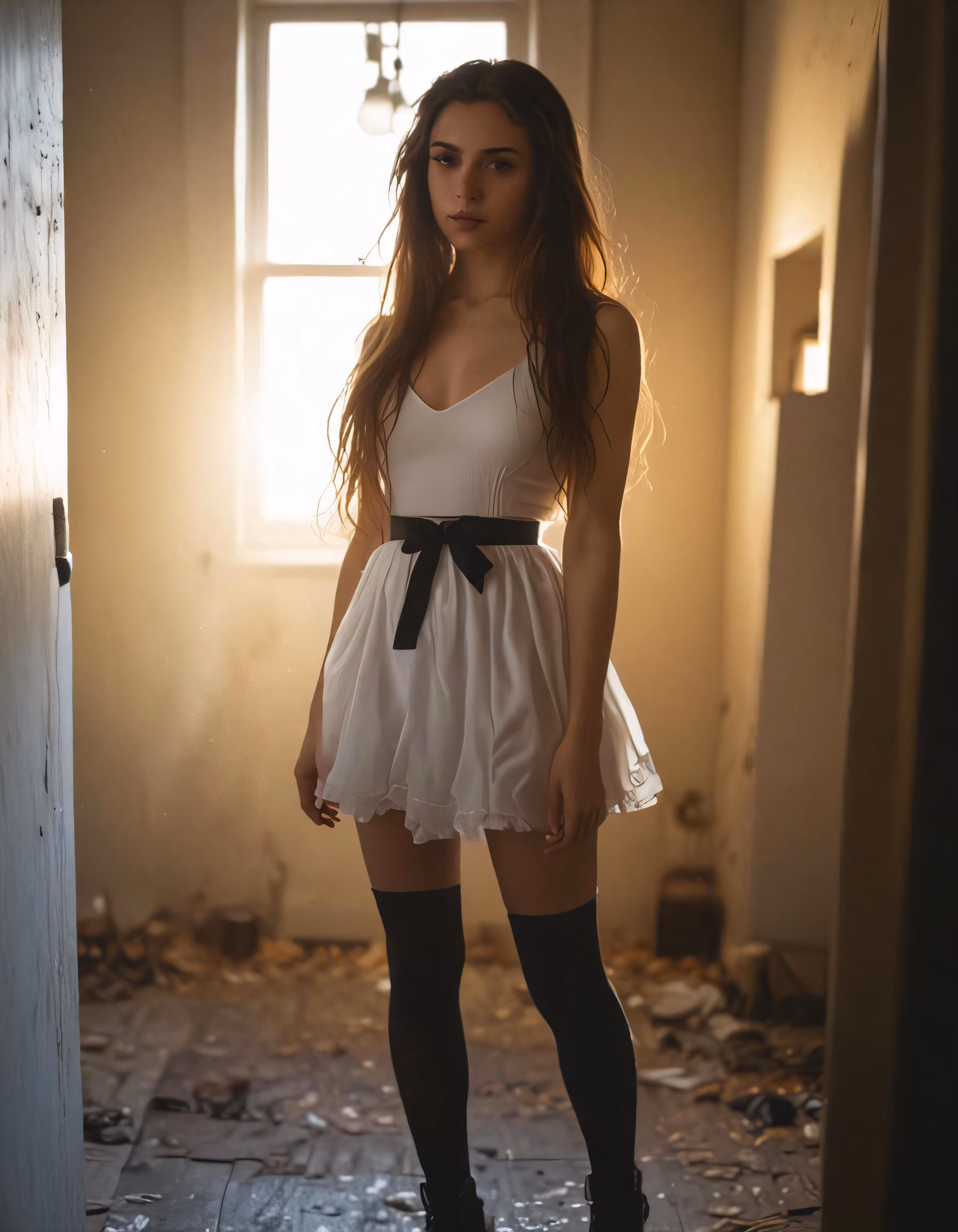 High resolution picture, free to use, a woman in white is wearing thigh high socks and stockings