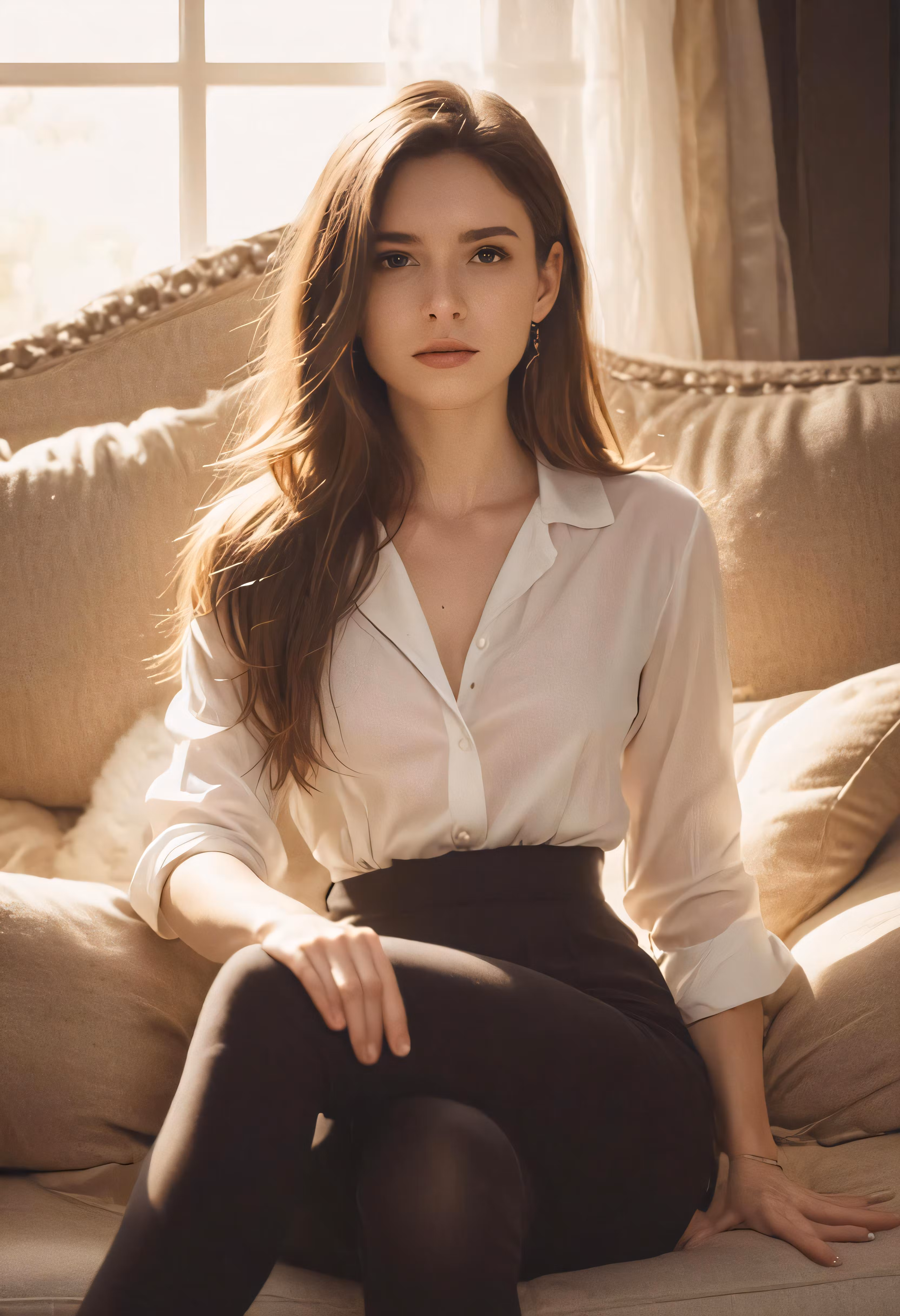 High resolution picture, free to use, a woman in white shirt and brown pants sitting on couch