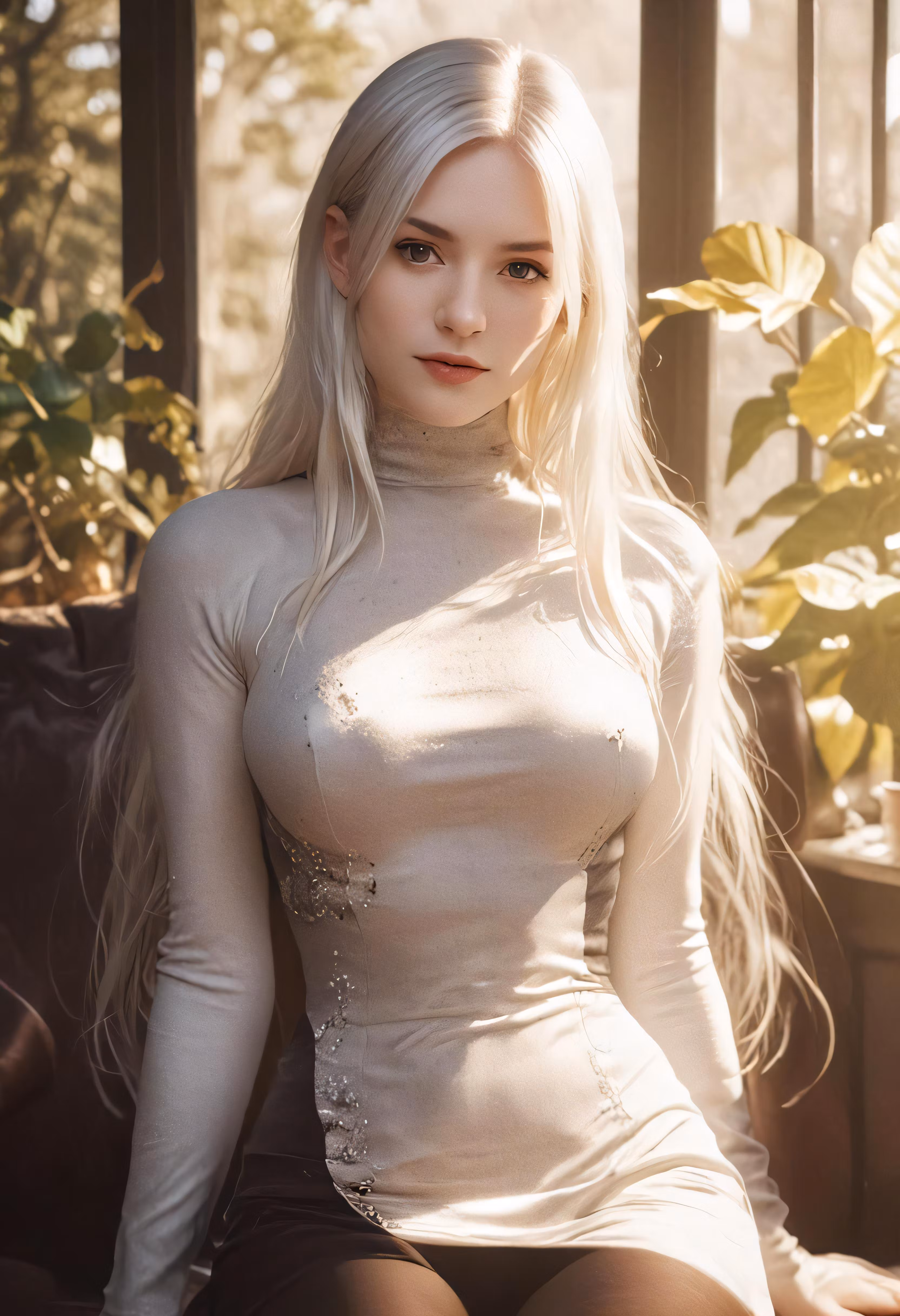 High resolution picture, free to use, a woman in white top sitting on brown chair