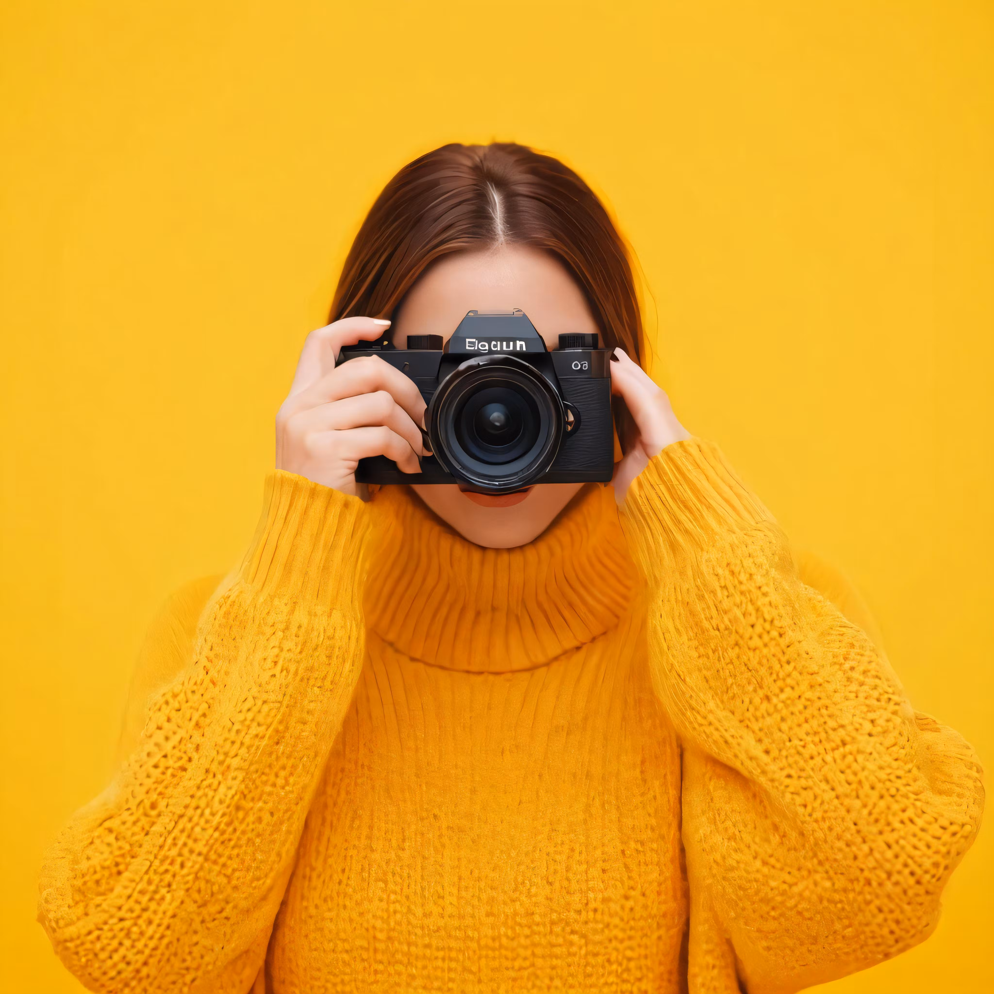High resolution picture, free to use, a woman in yellow holding up her camera