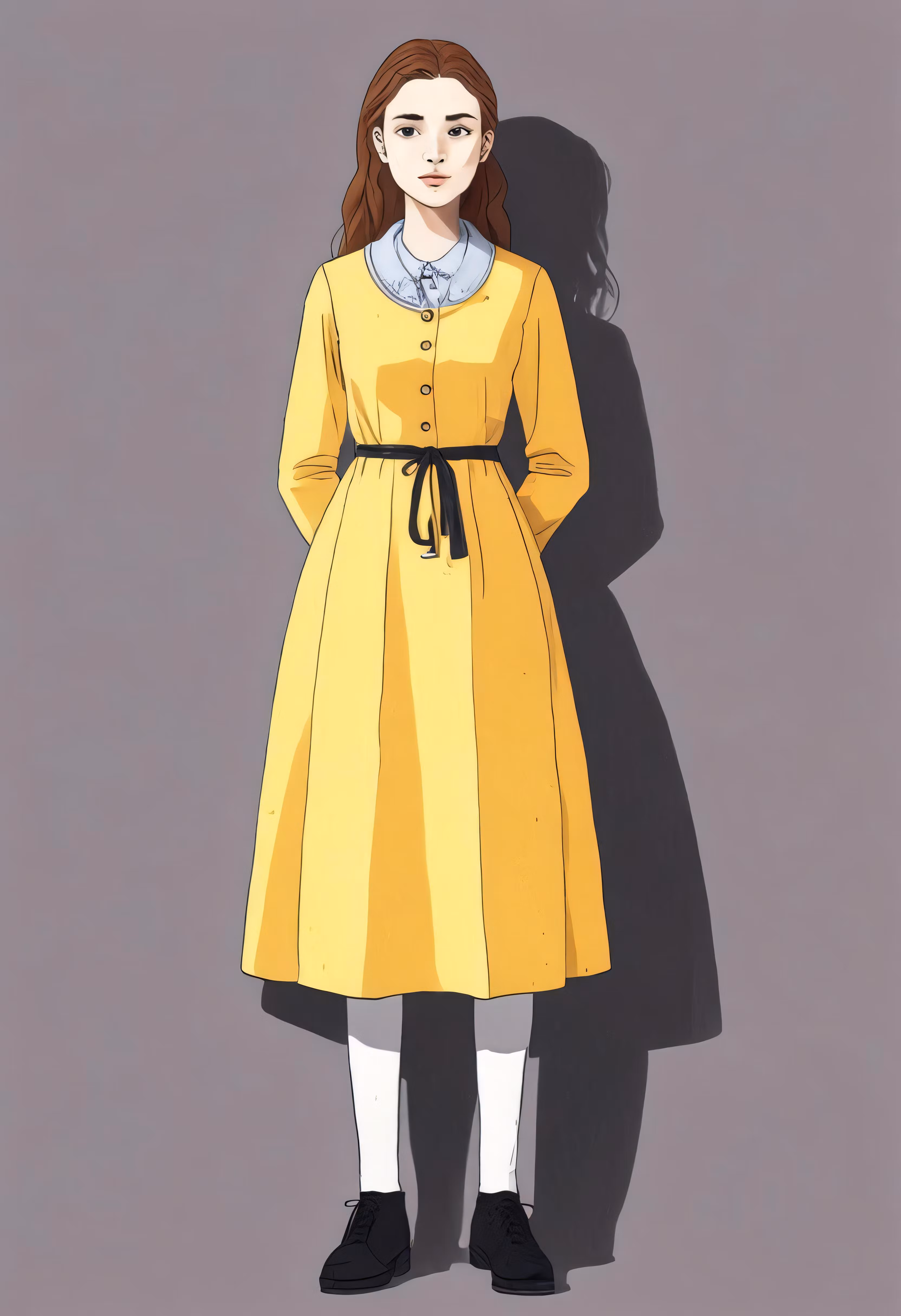 High resolution picture, free to use, a woman in yellow is standing against a gray wall