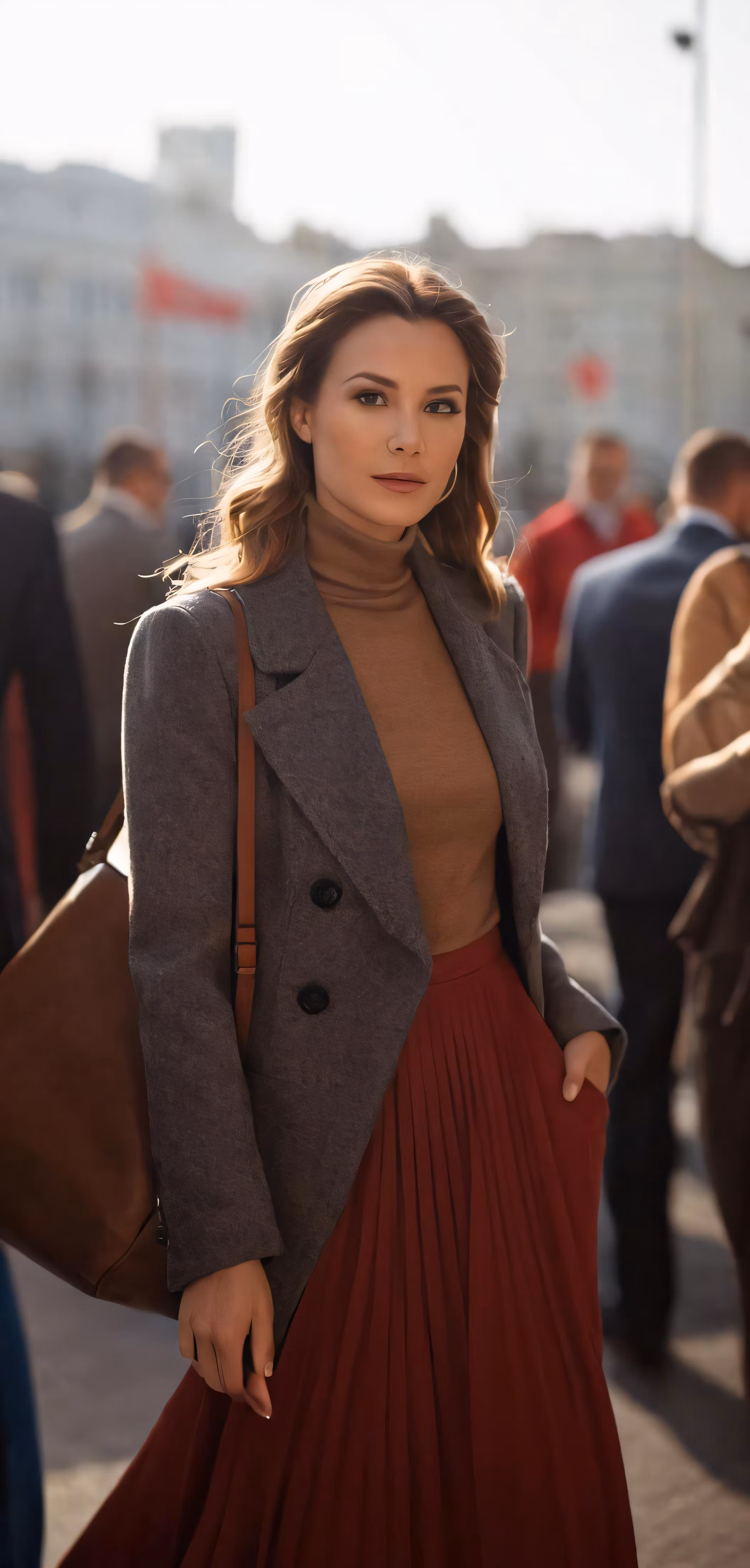 High resolution picture, free to use, a woman is dressed in a brown sweater and red pleated skirt, standing outdoors