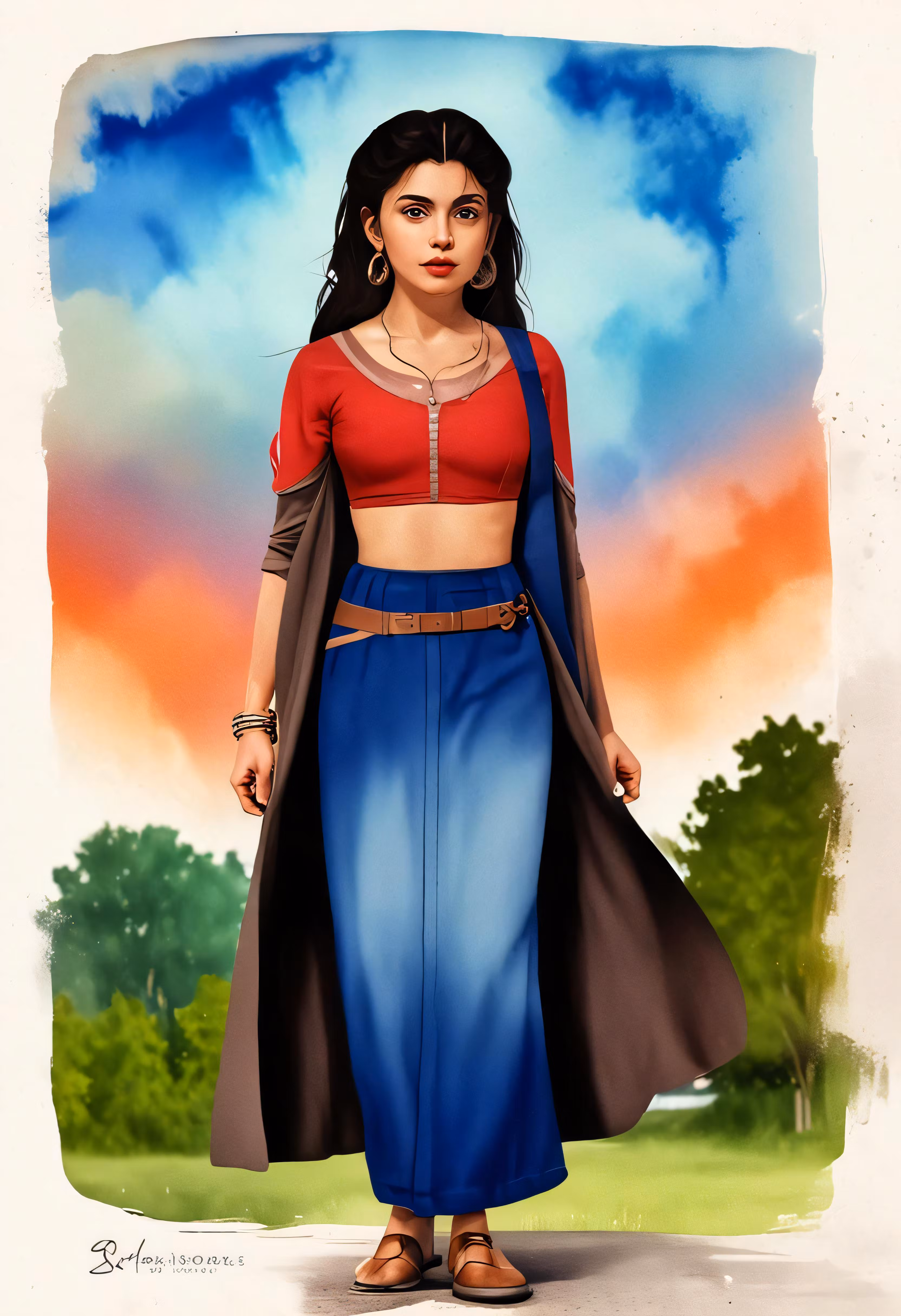High resolution picture, free to use, a woman is dressed in a red shirt and blue skirt
