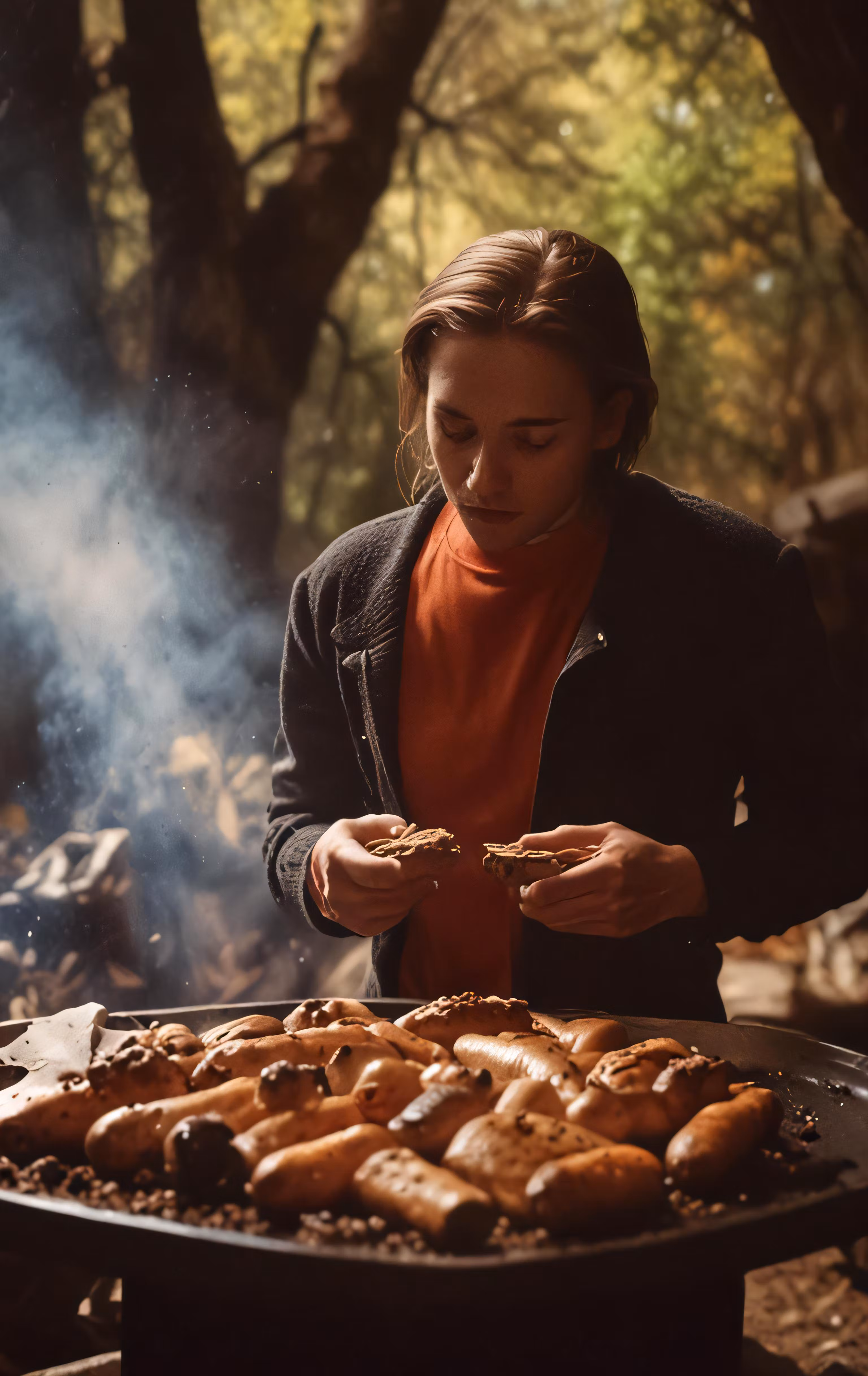High resolution picture, free to use, a woman is eating at an outdoor grill