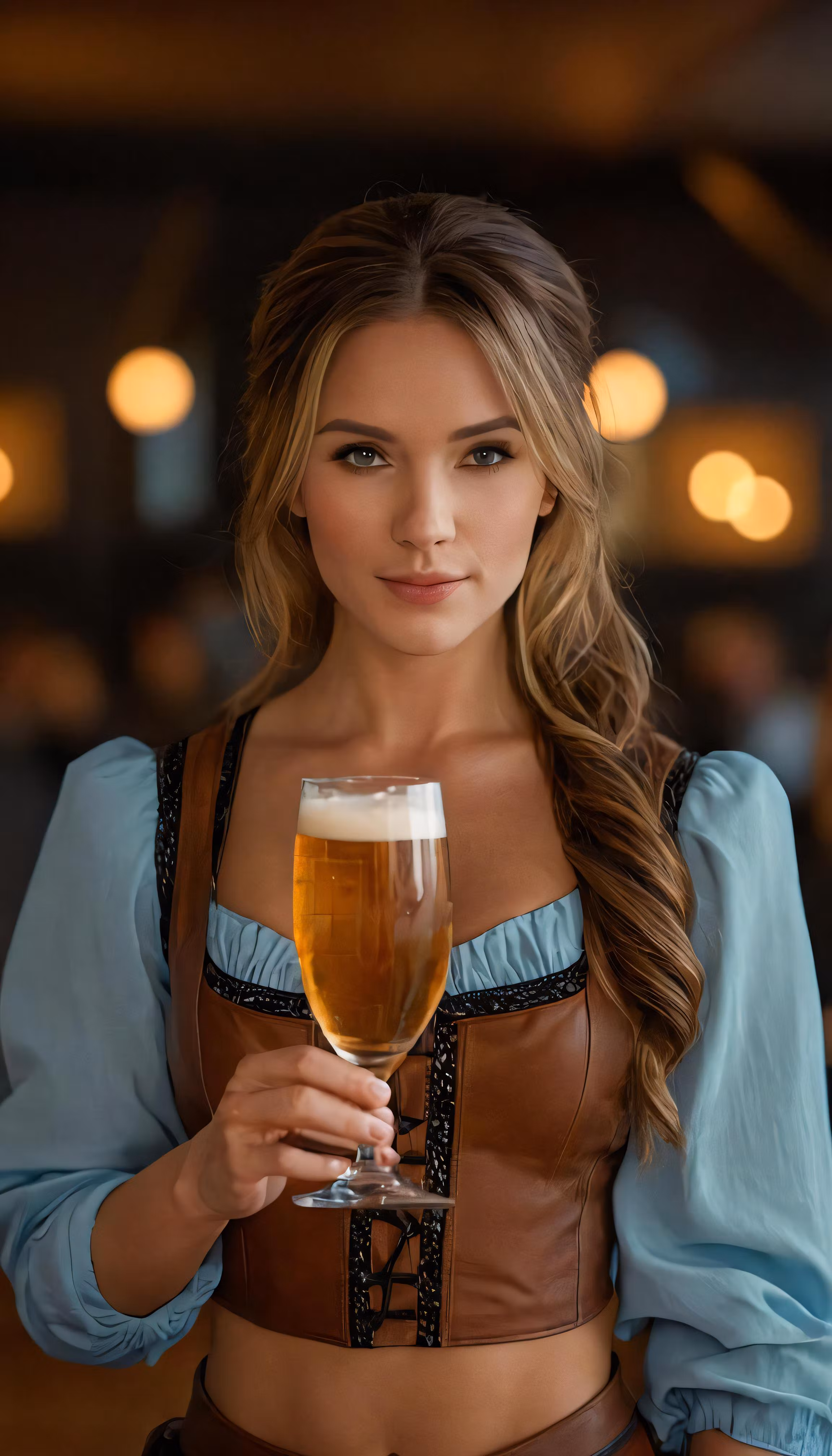 High resolution picture, free to use, a woman is holding a glass of beer and smiling