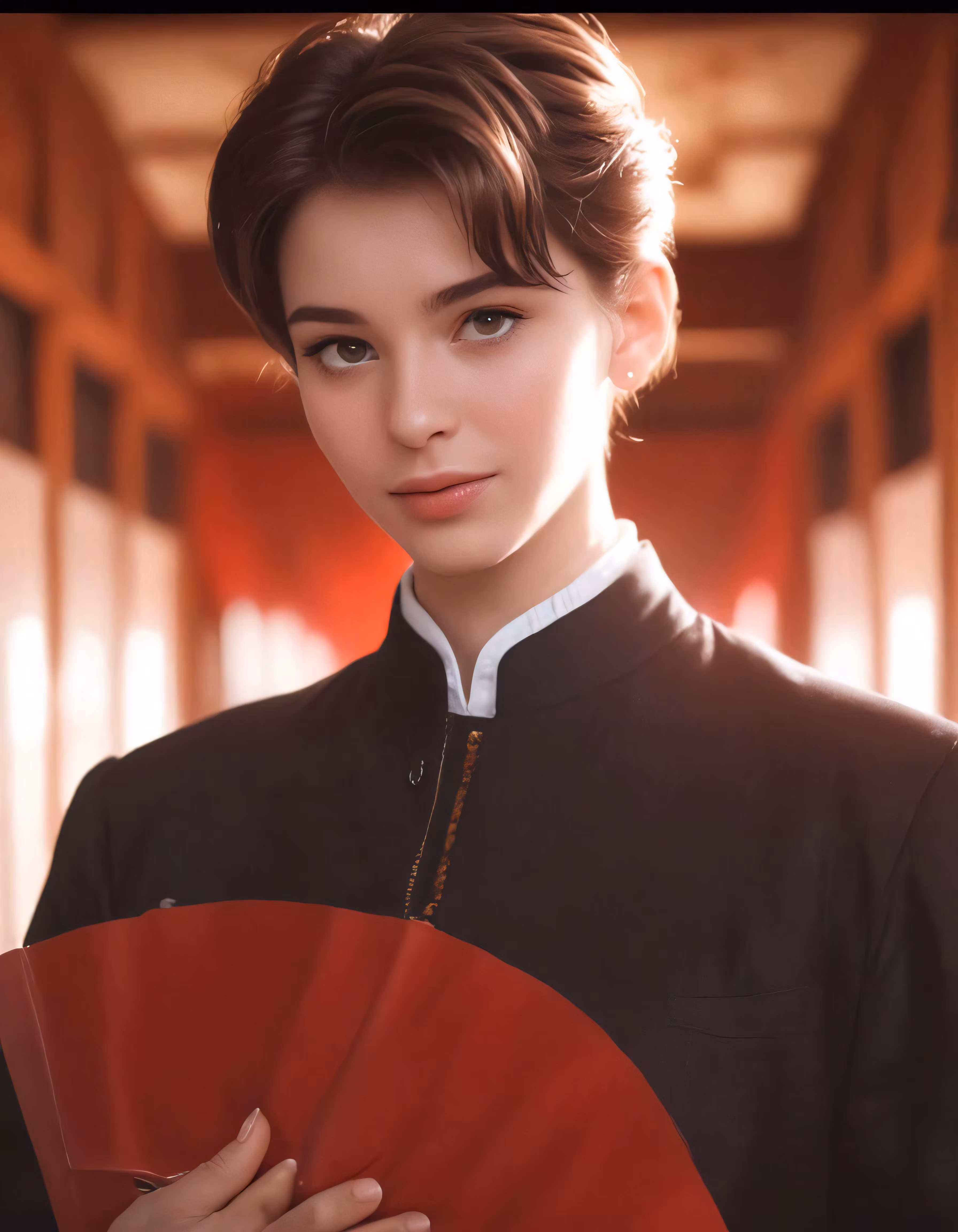 High resolution picture, free to use, a woman is holding a red fan and wearing a black jacket