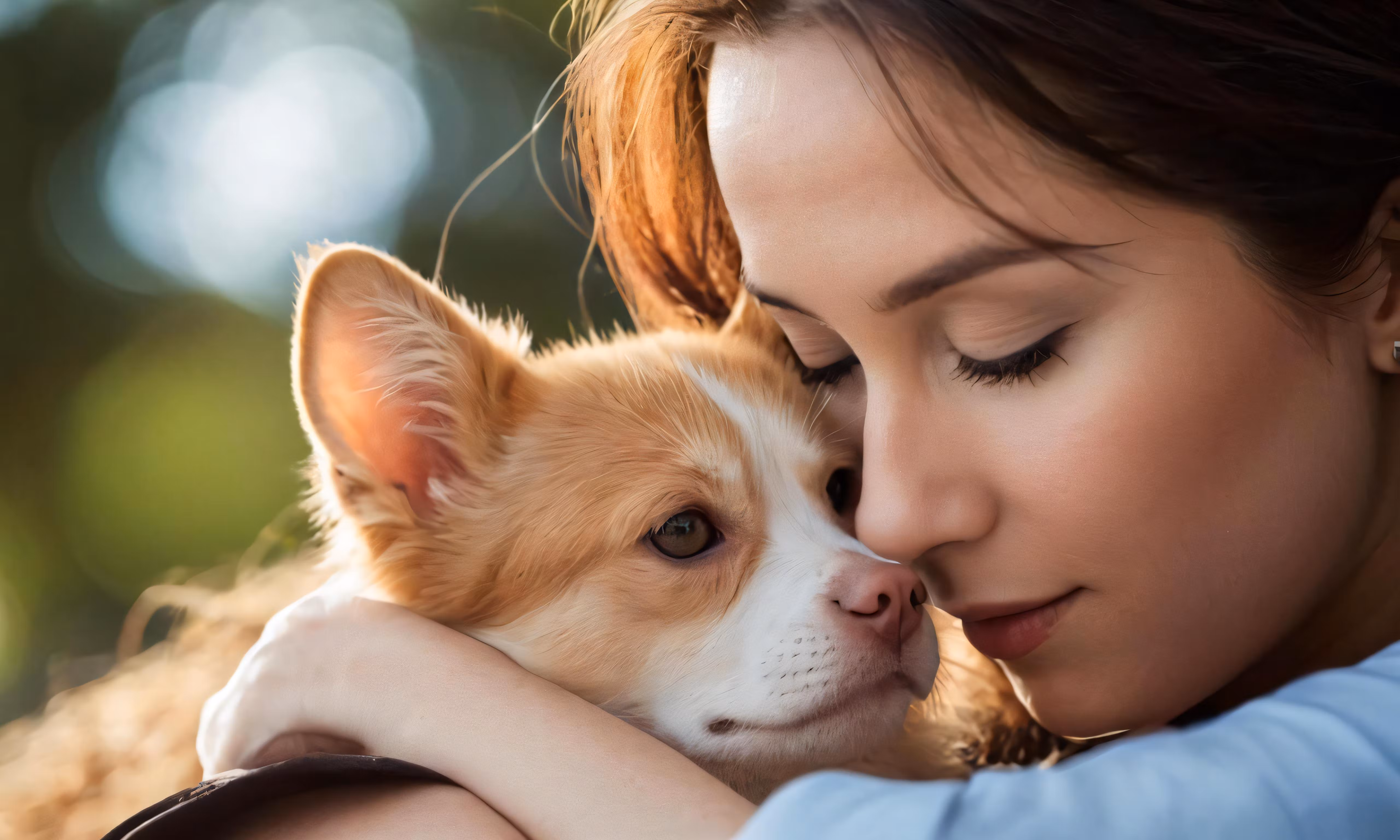 High resolution picture, free to use, a woman is hugging a small brown and white dog