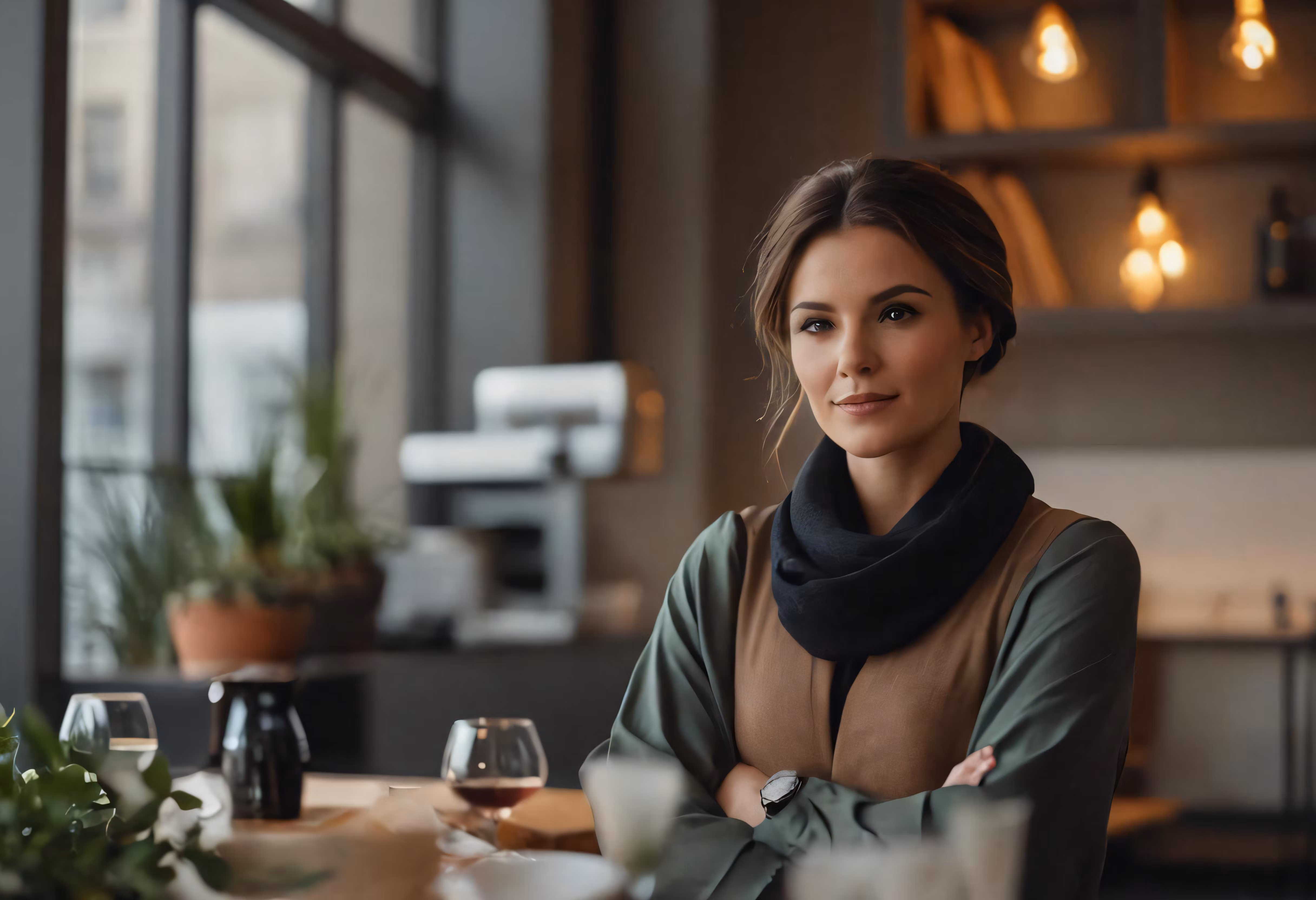 High resolution picture, free to use, a woman is looking at the camera while sitting with her hands crossed and smiling