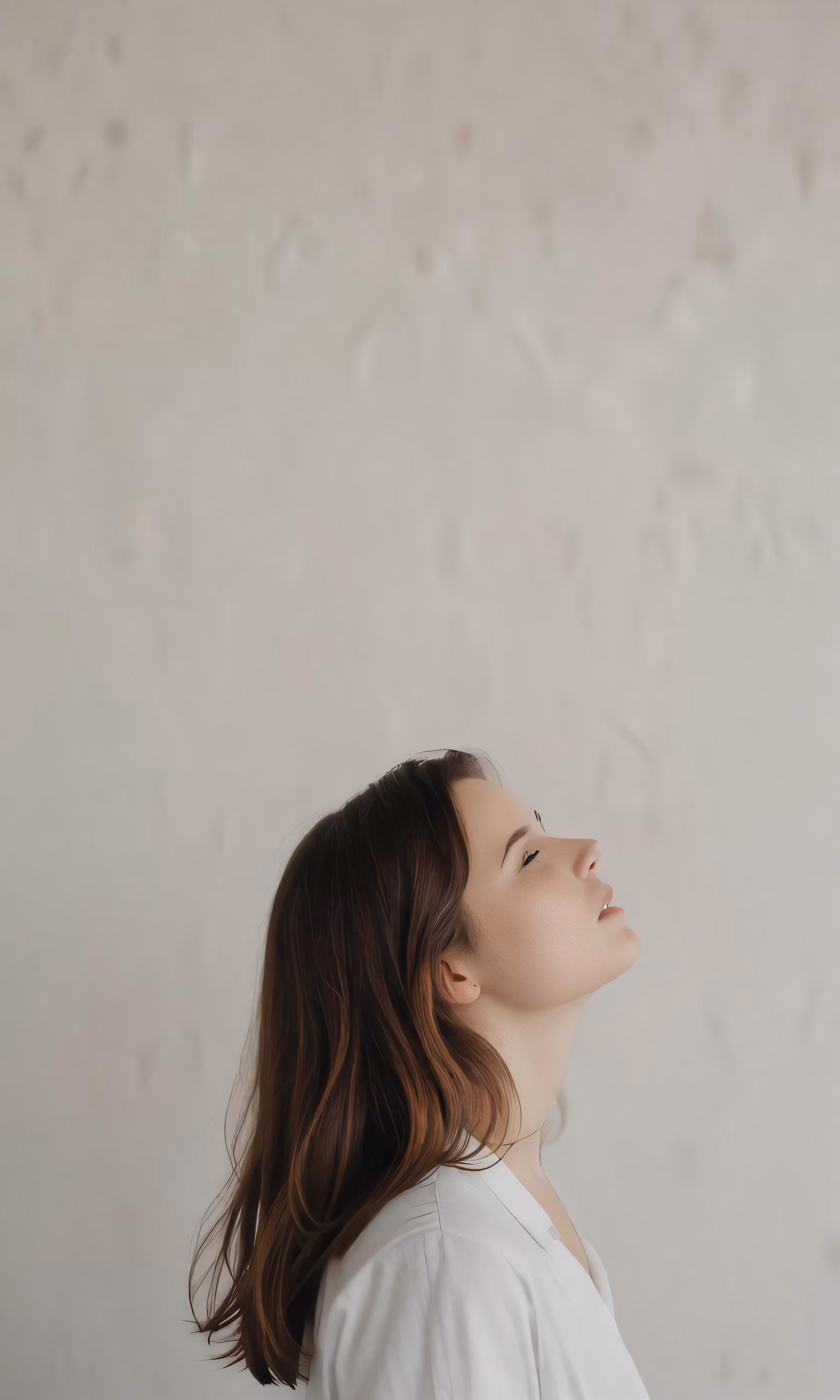 High resolution picture, free to use, a woman is looking up and there is a wall behind her