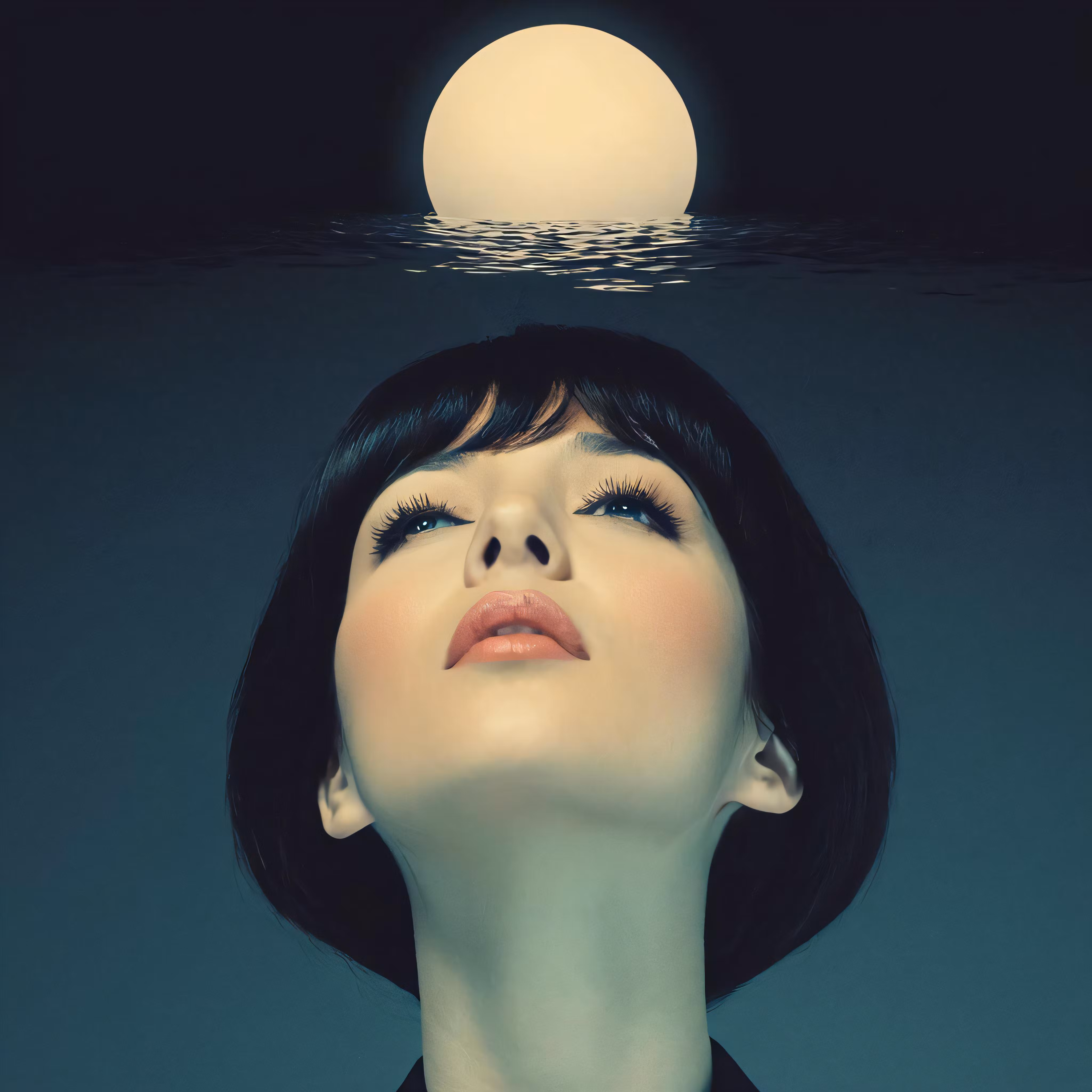 High resolution picture, free to use, a woman is looking up at the moon above her head