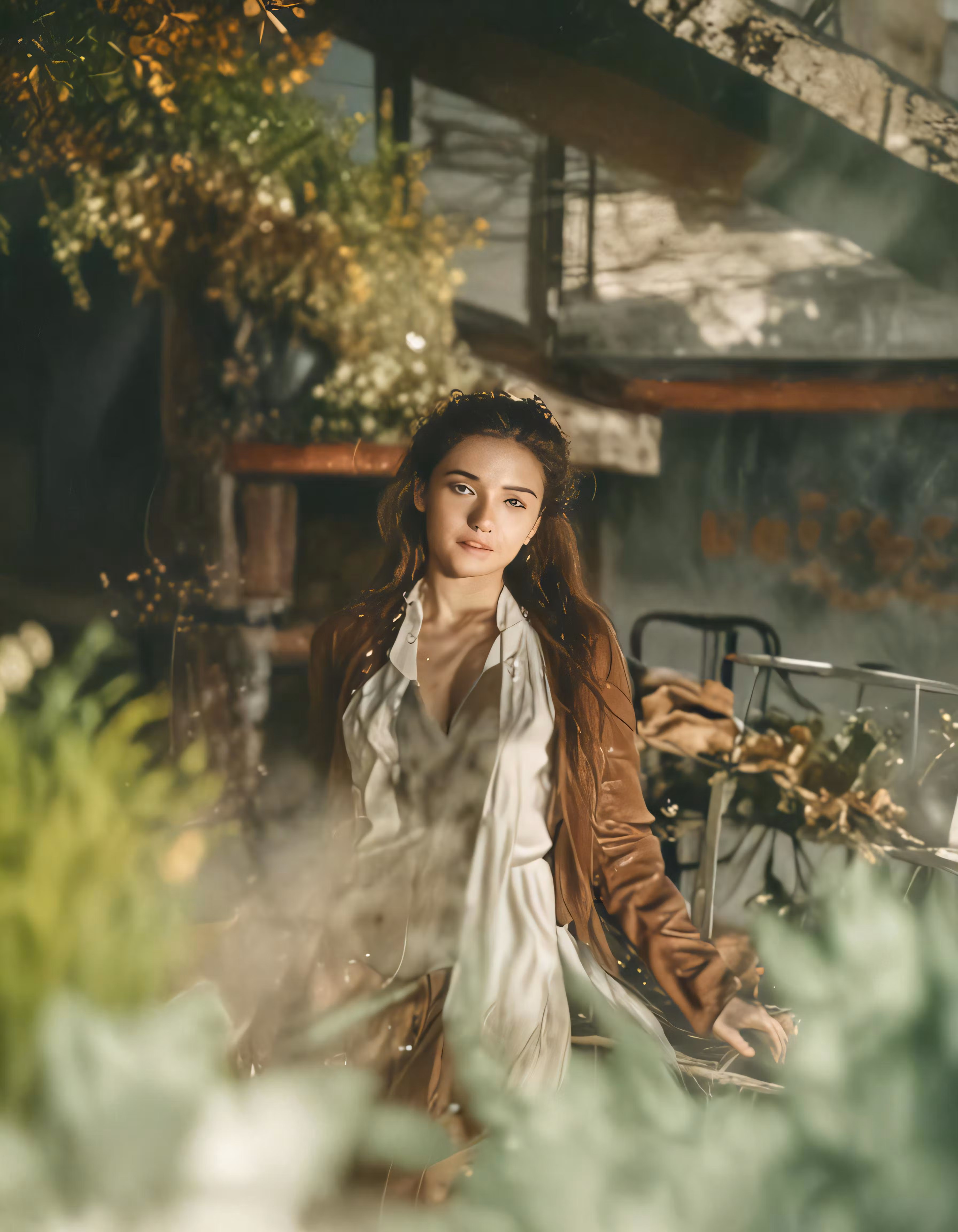 High resolution picture, free to use, a woman is posing by a table with pots of flowers and other decorative plants