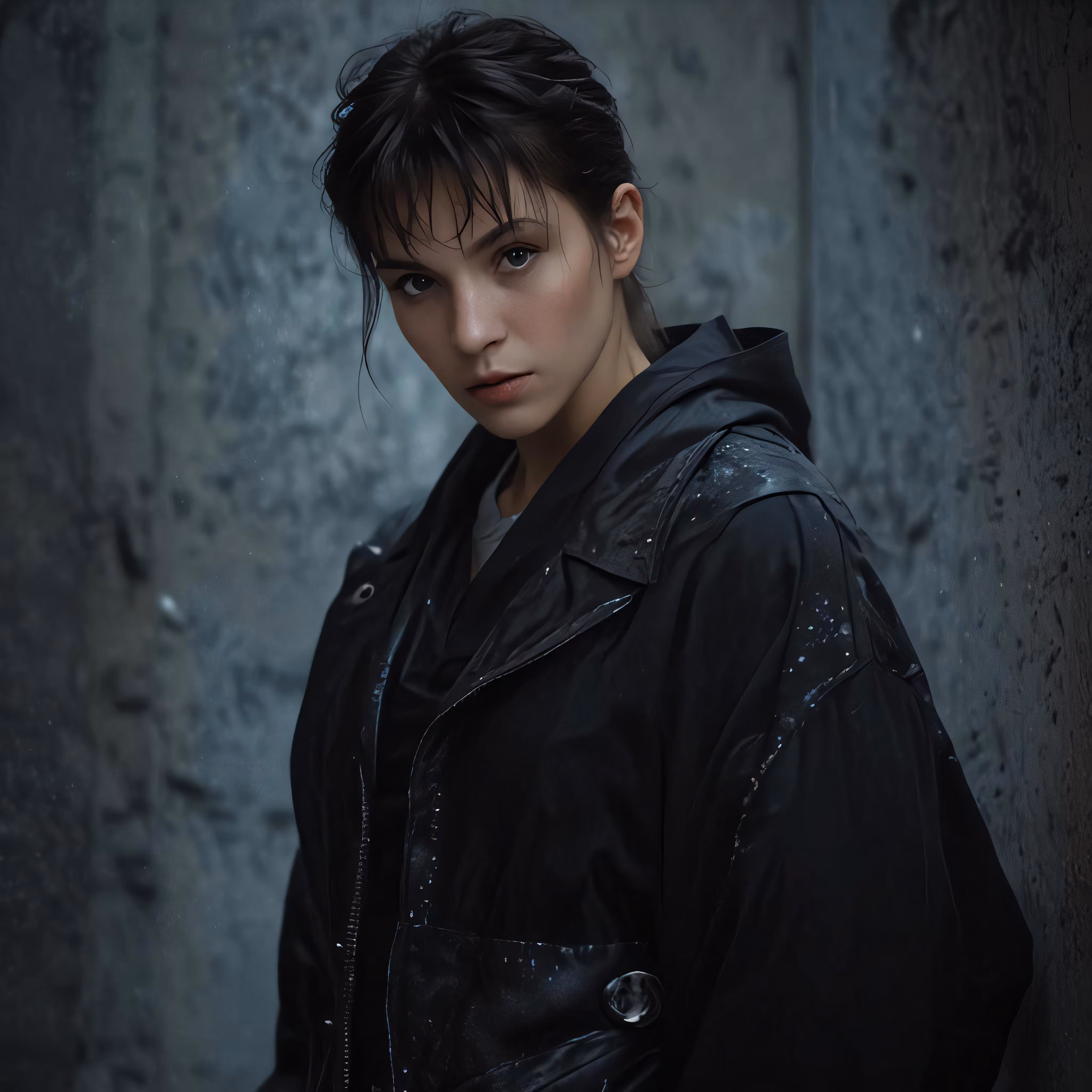High resolution picture, free to use, a woman is posing by a wall in the rain
