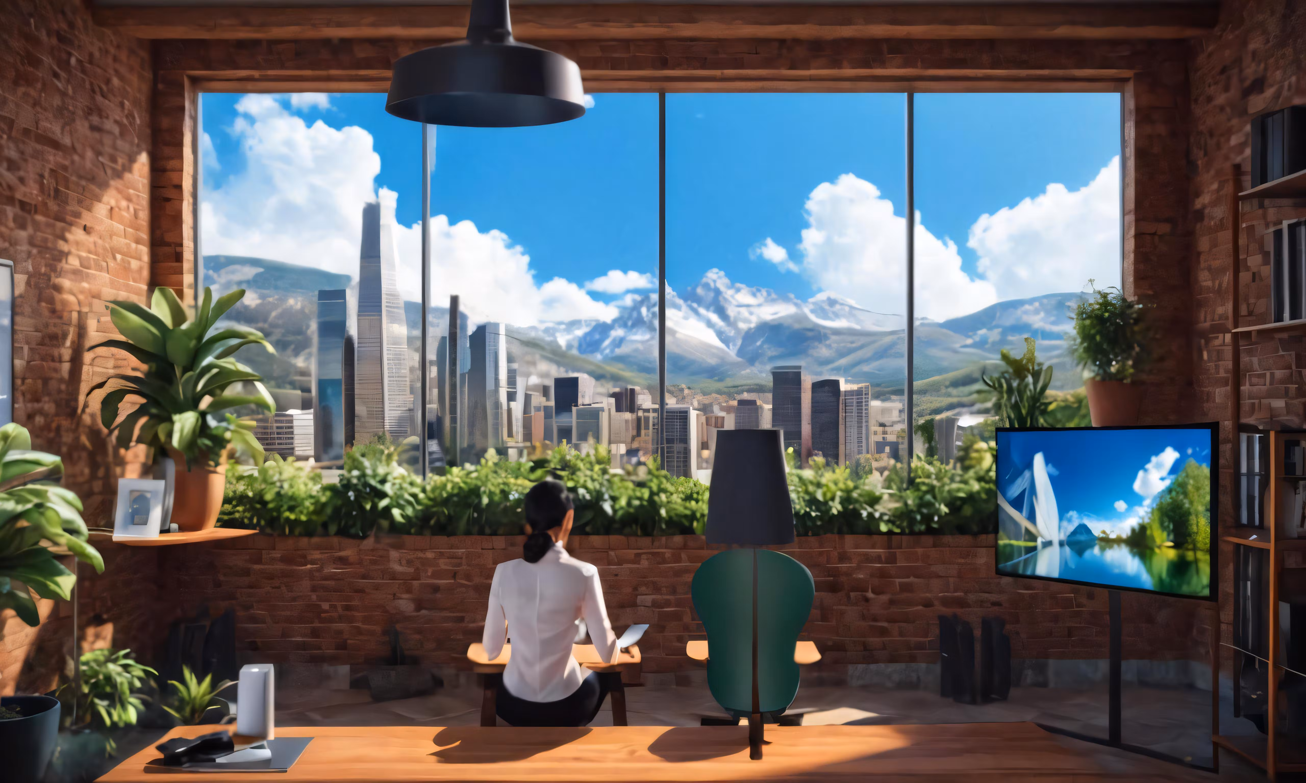 High resolution picture, free to use, a woman is sitting at a desk and looking out the window with a city view