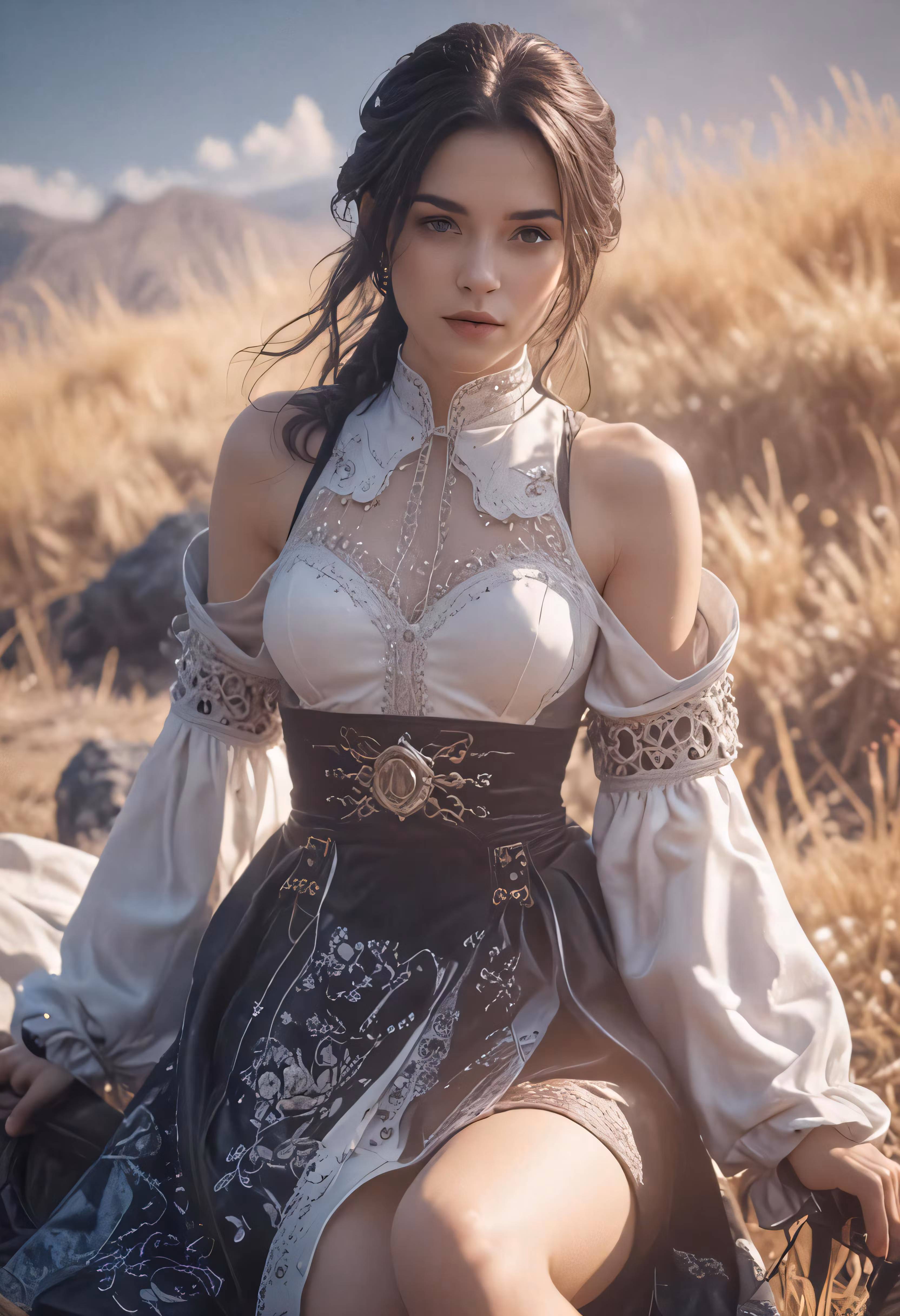 High resolution picture, free to use, a woman is sitting in a field wearing a dress