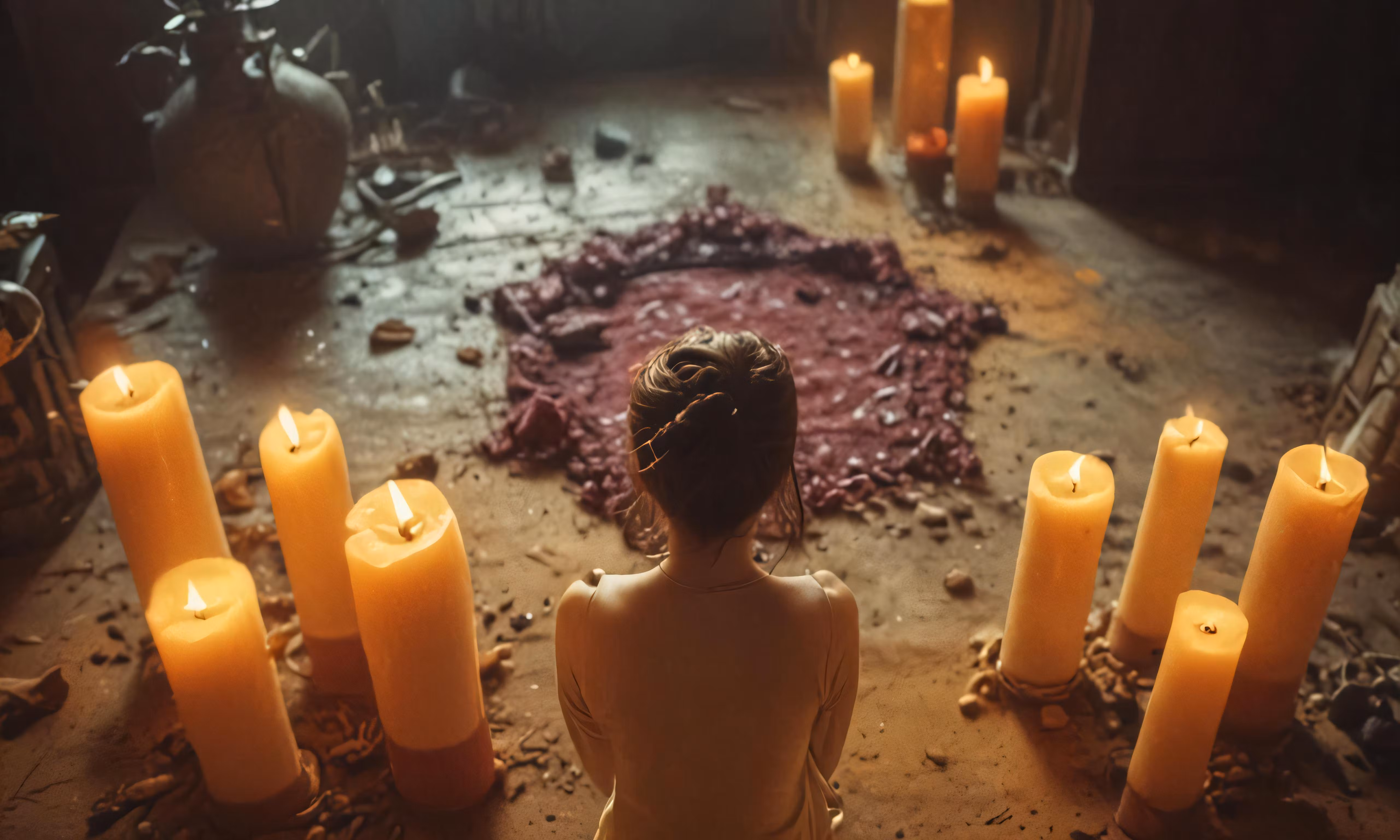 High resolution picture, free to use, a woman is sitting in front of some candles
