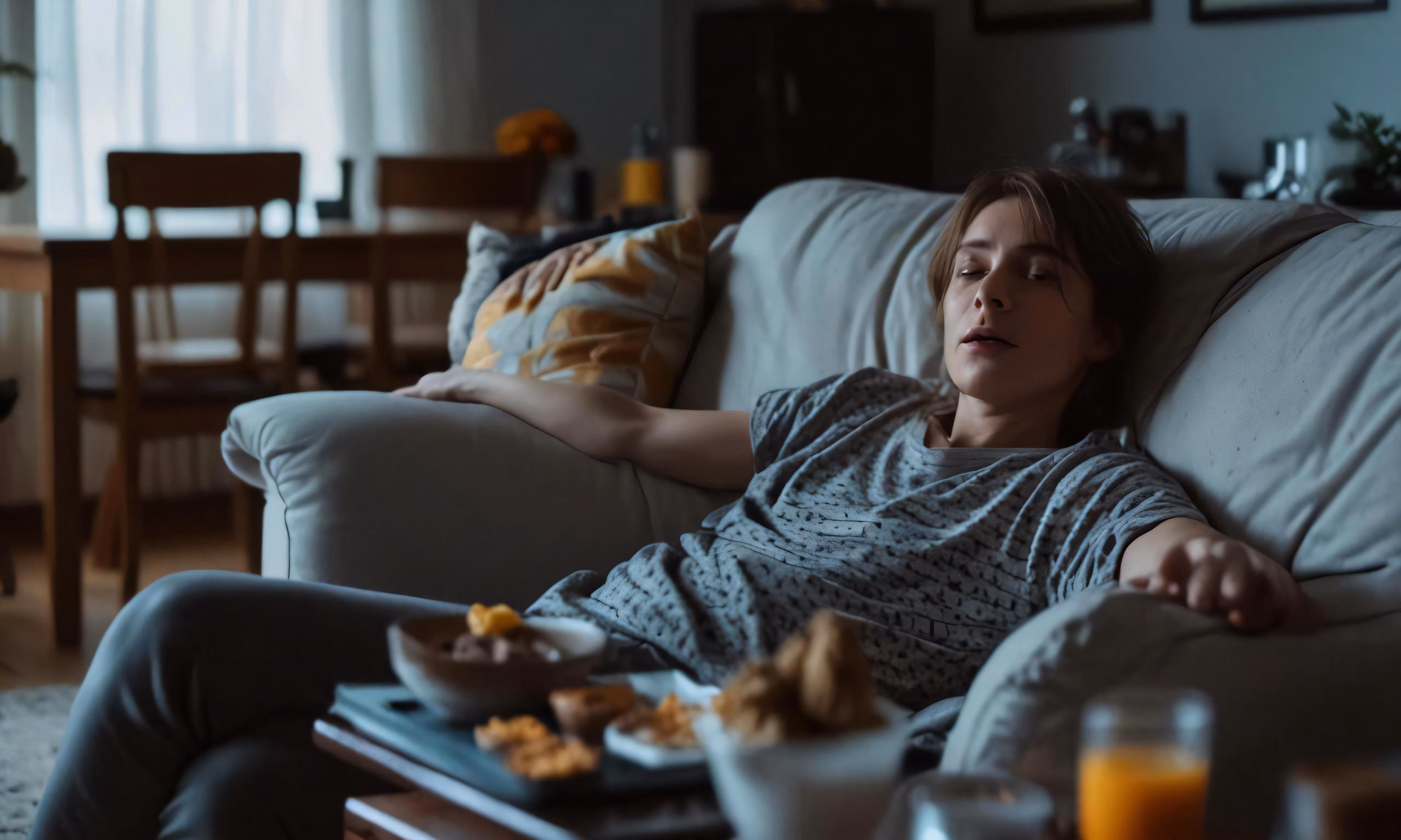 High resolution picture, free to use, a woman is sitting on a couch and eating
