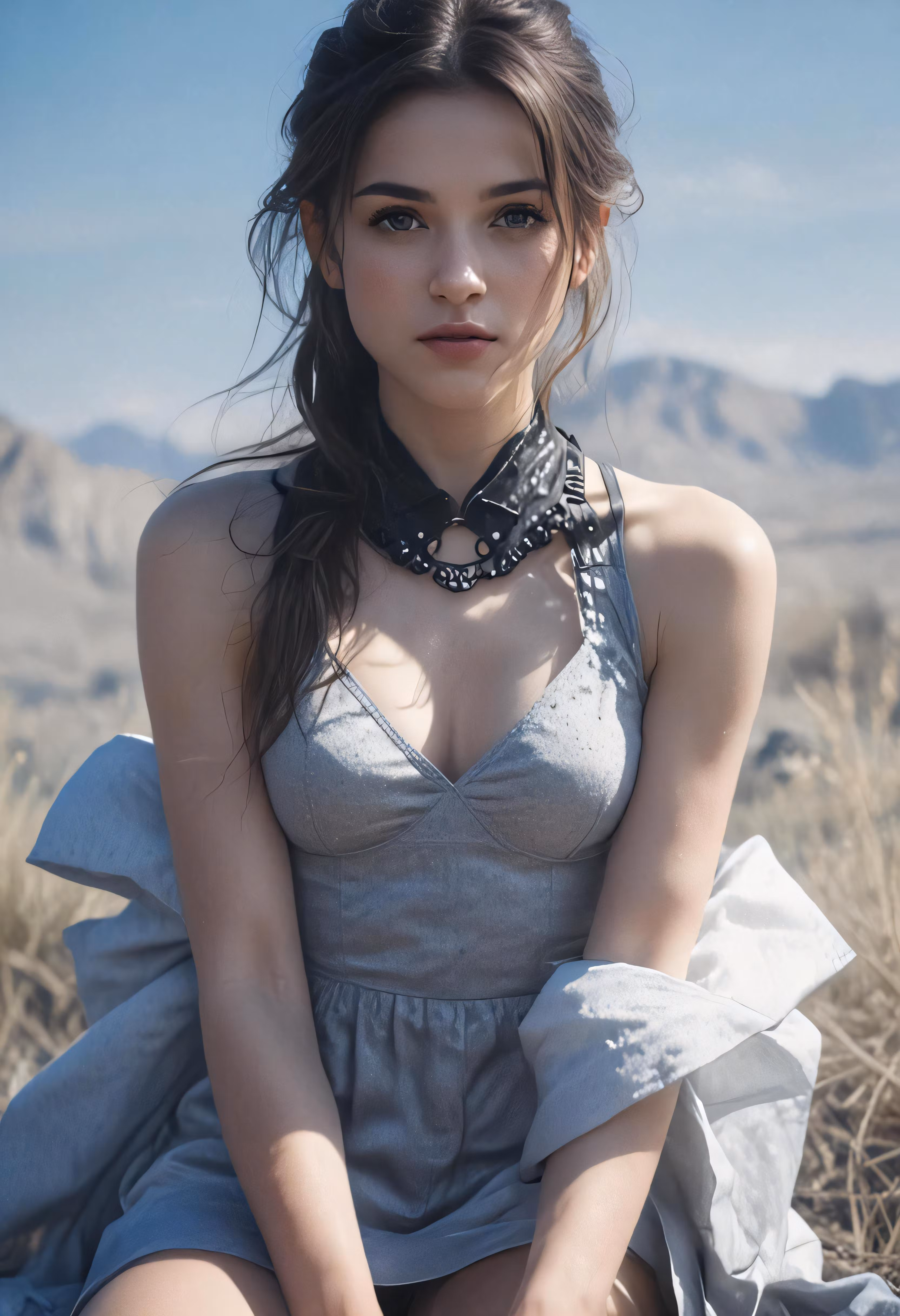 High resolution picture, free to use, a woman is sitting on the ground in a dress