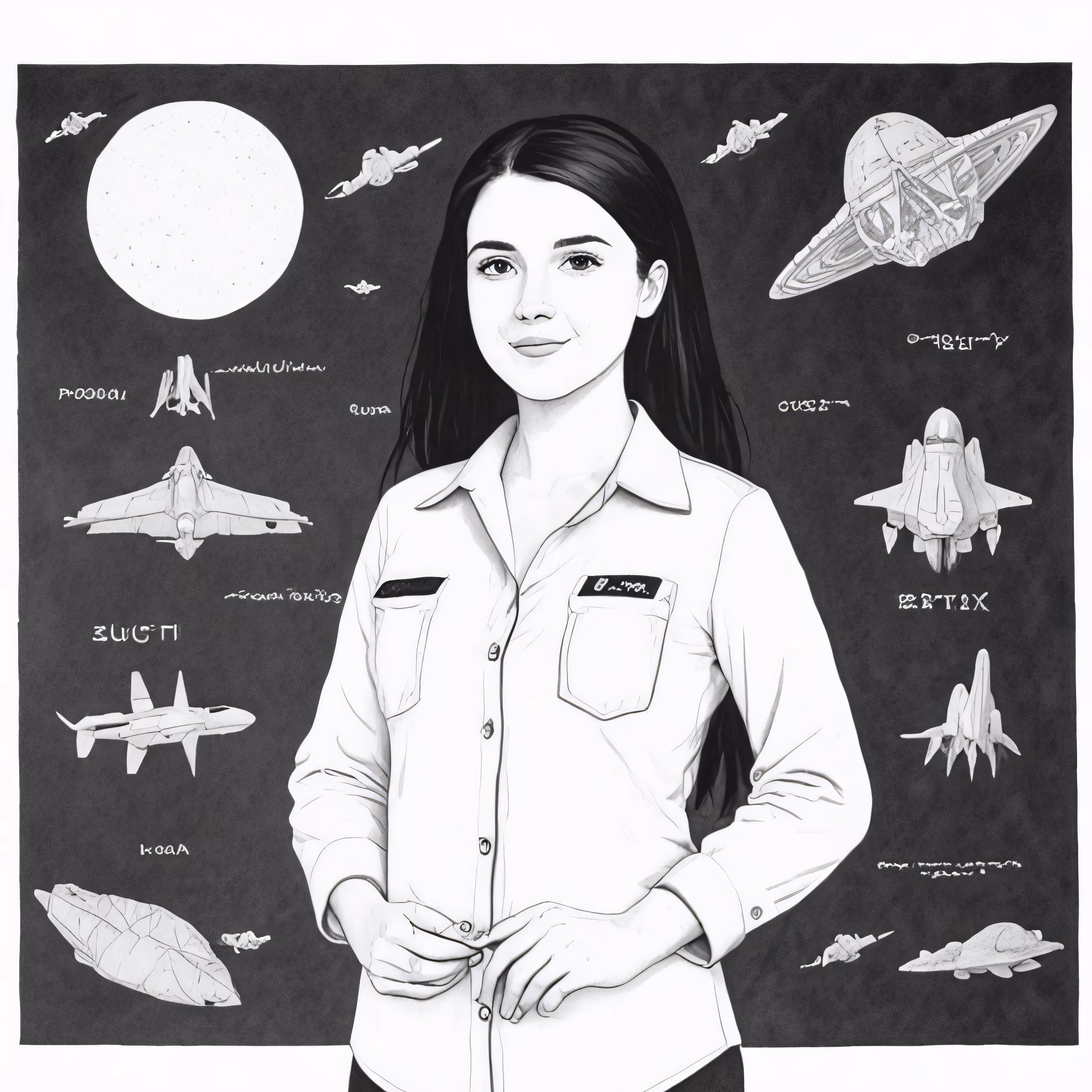 High resolution picture, free to use, a woman is standing in front of a drawing of spaceships and ships