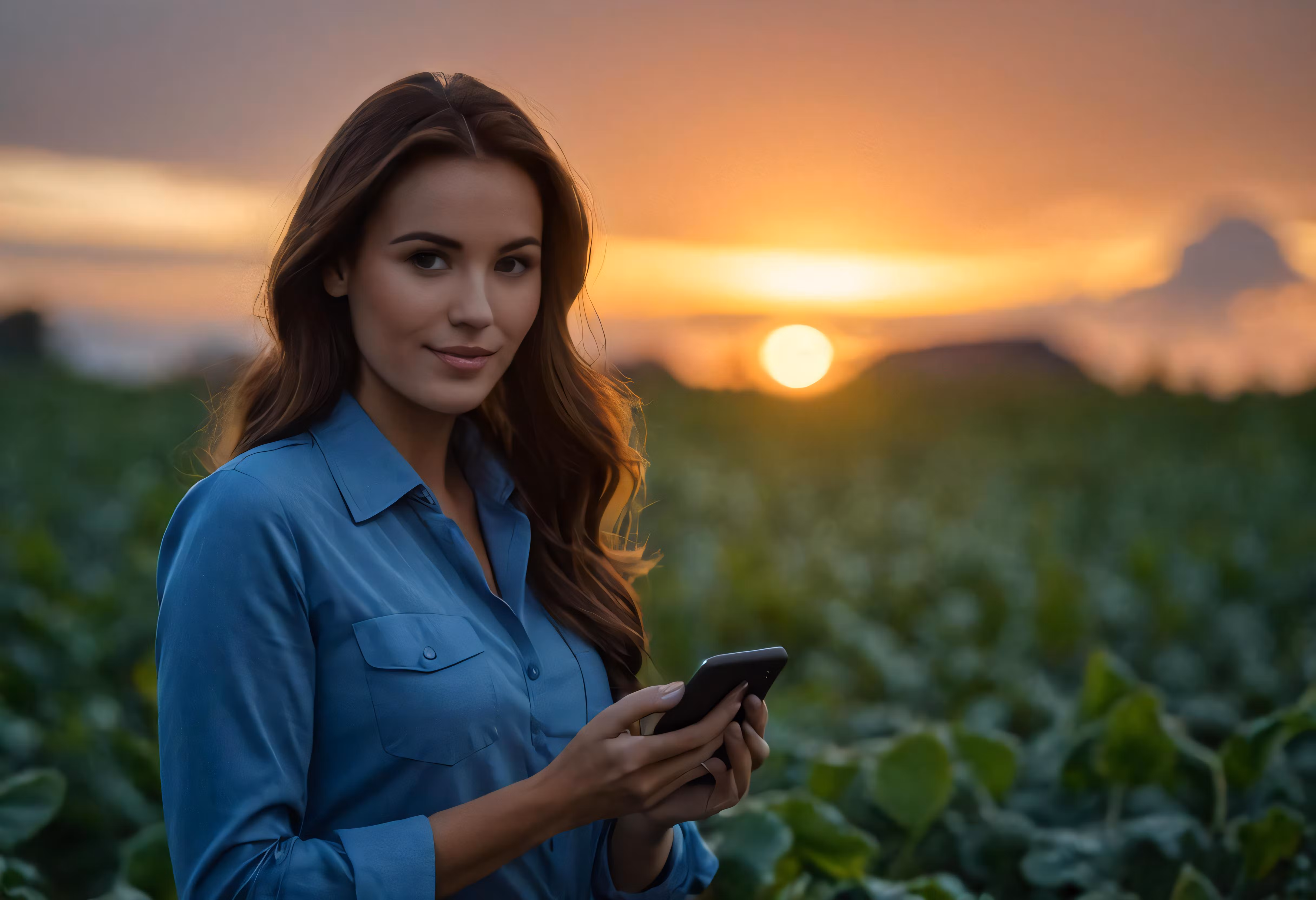 High resolution picture, free to use, a woman is standing in the middle of a field, holding her cell phone
