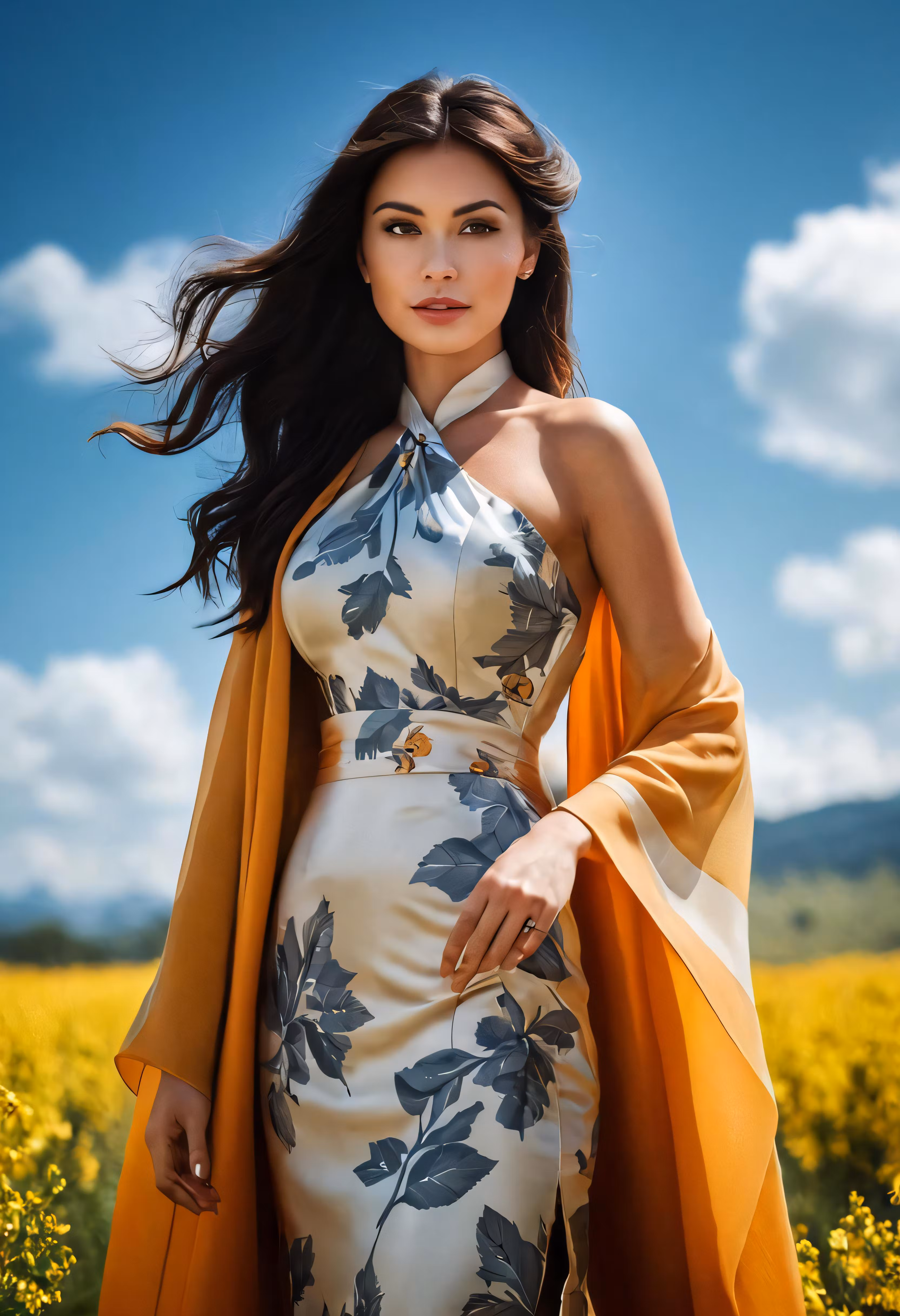 High resolution picture, free to use, a woman is standing near yellow flowers wearing an outfit