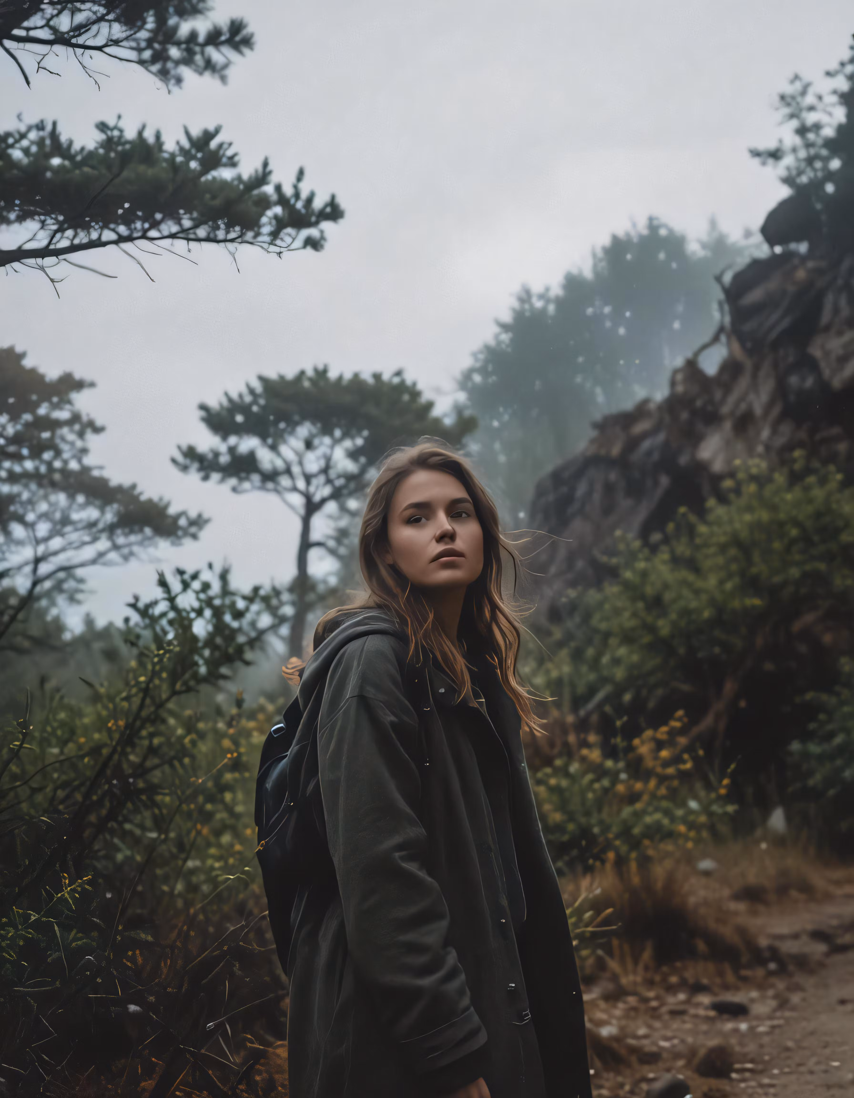 High resolution picture, free to use, a woman is standing on a path by some trees