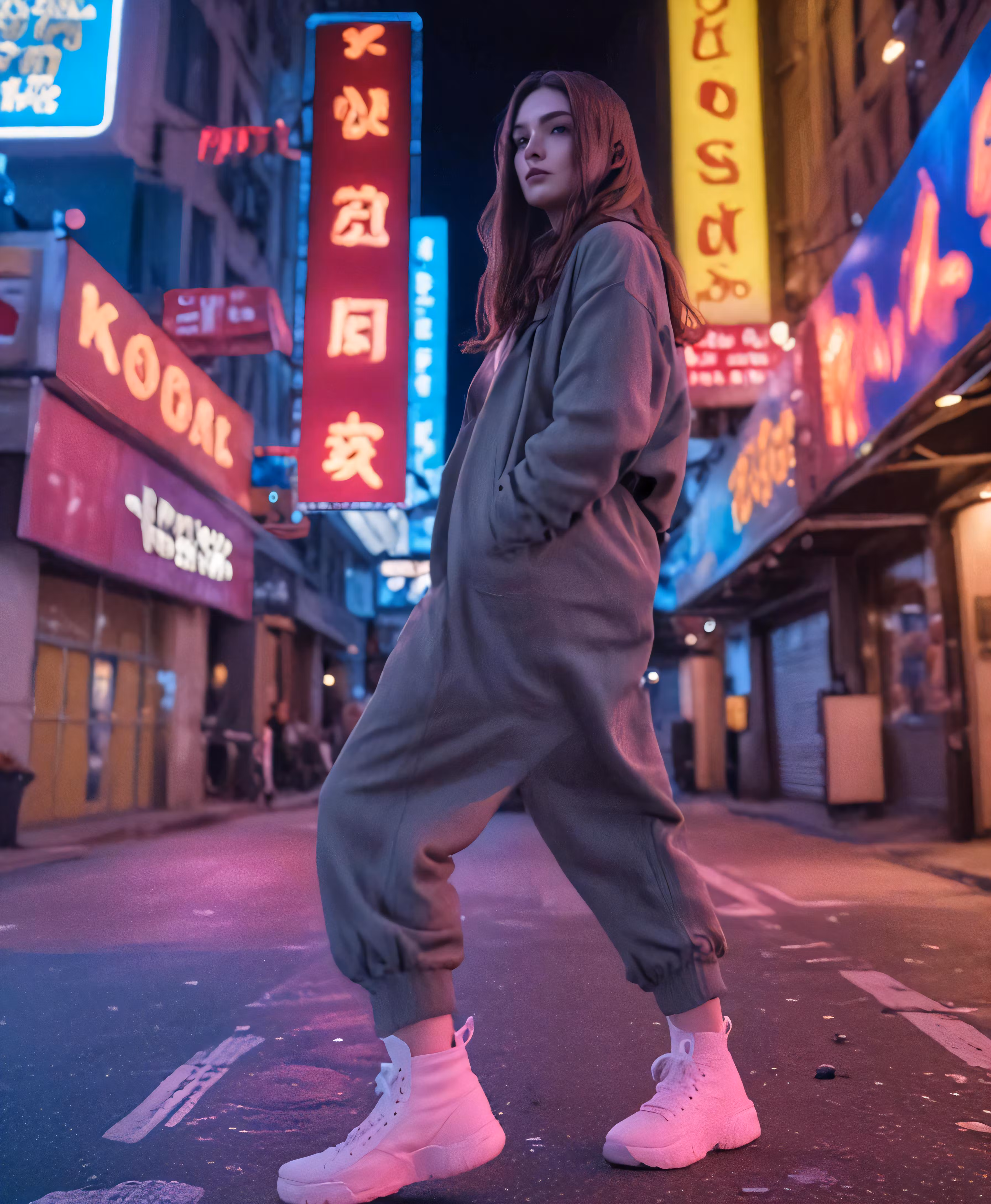 High resolution picture, free to use, a woman is standing on the street in front of neon signs