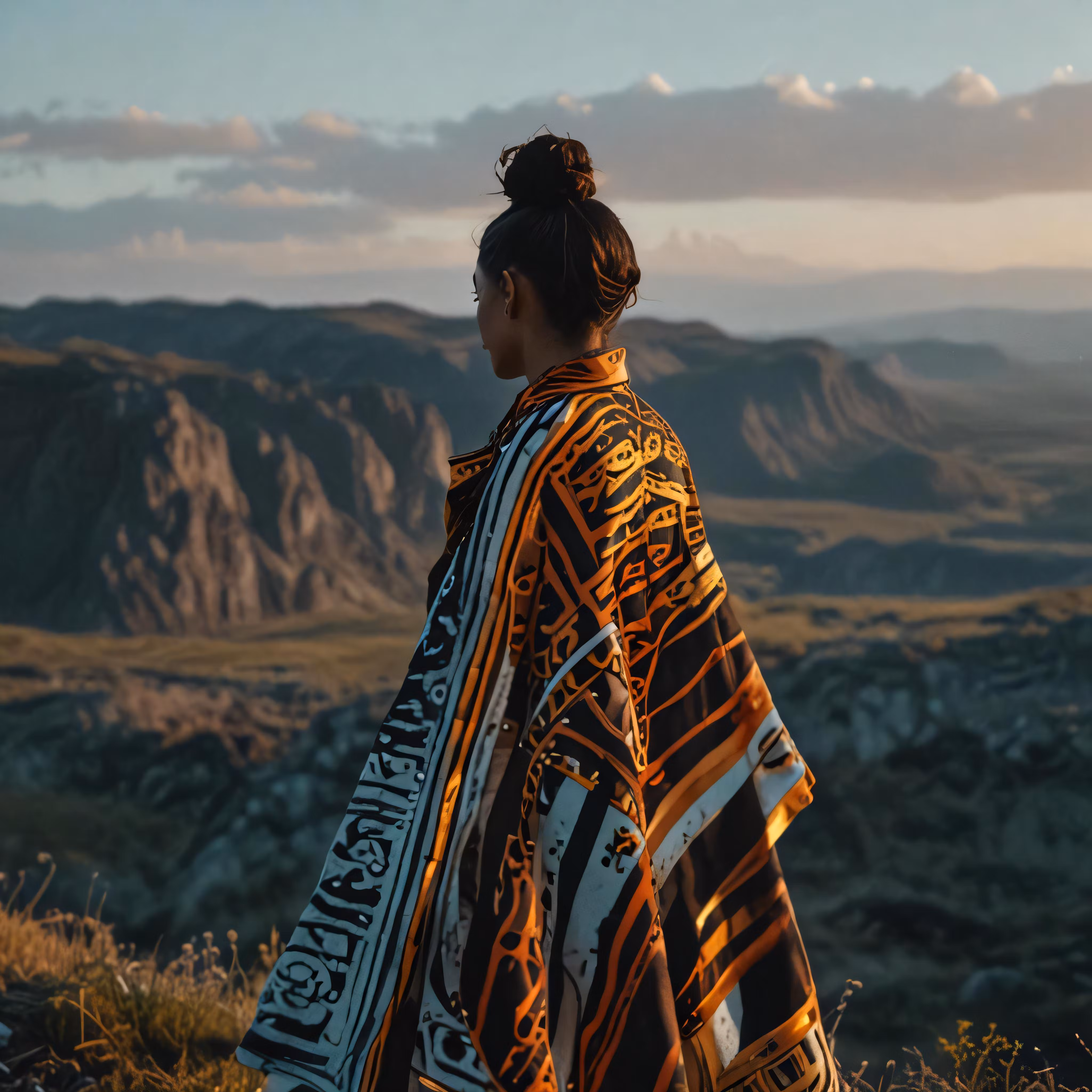 High resolution picture, free to use, a woman is standing on the top of a hill and she has a wrap over her head