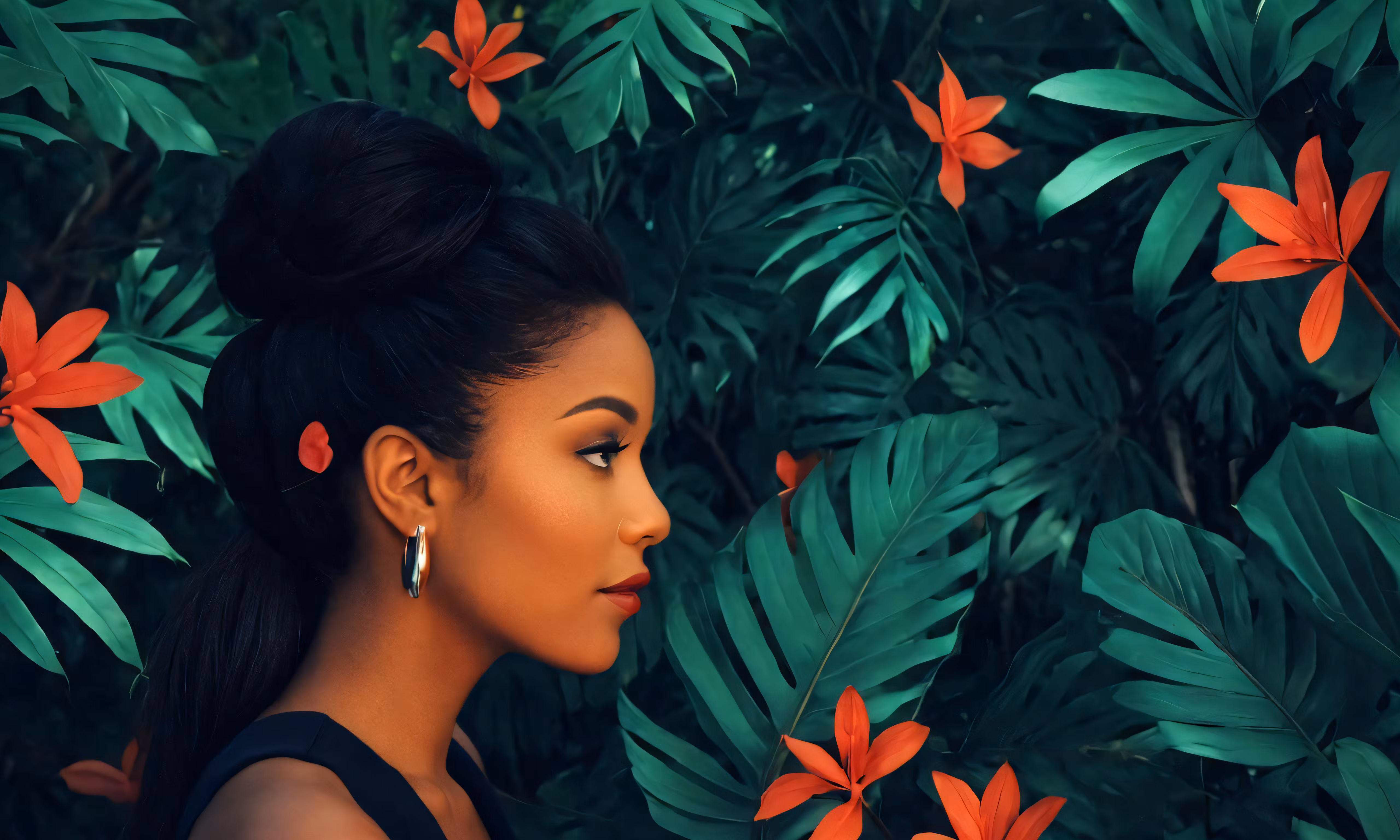 High resolution picture, free to use, a woman is standing outside with flowers in her hair