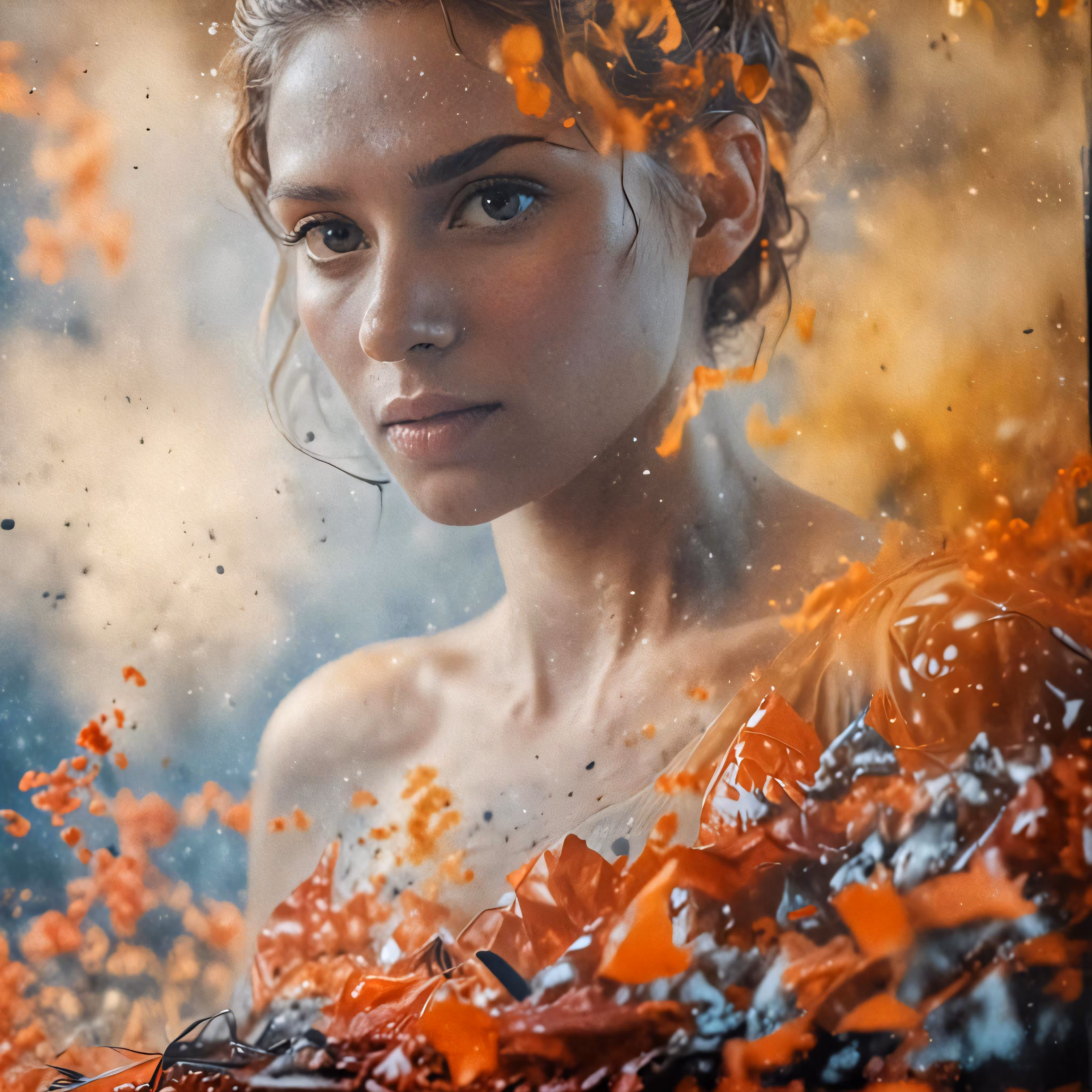 High resolution picture, free to use, a woman is surrounded by orange, yellow and grey water