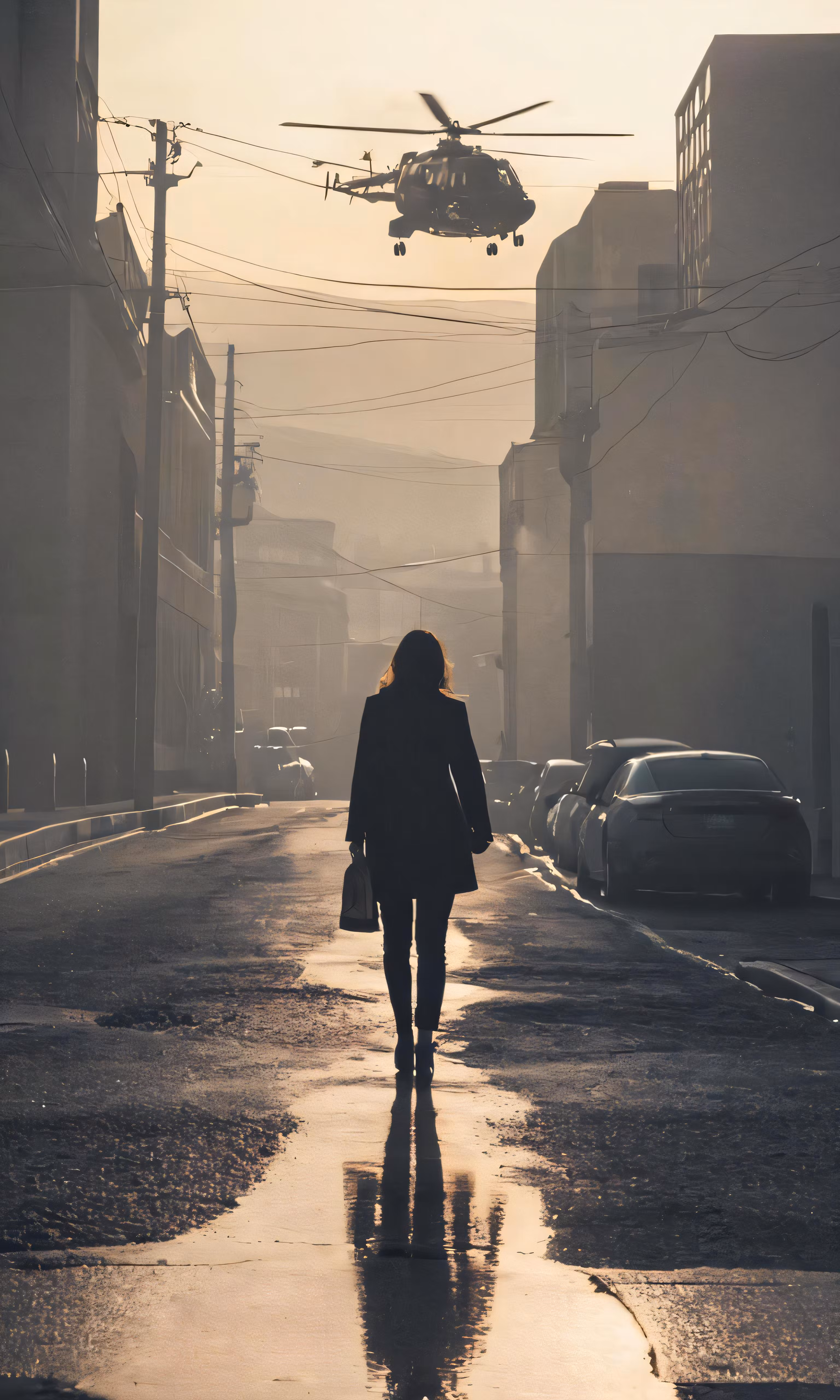 High resolution picture, free to use, a woman is walking on the street with a helicopter overhead