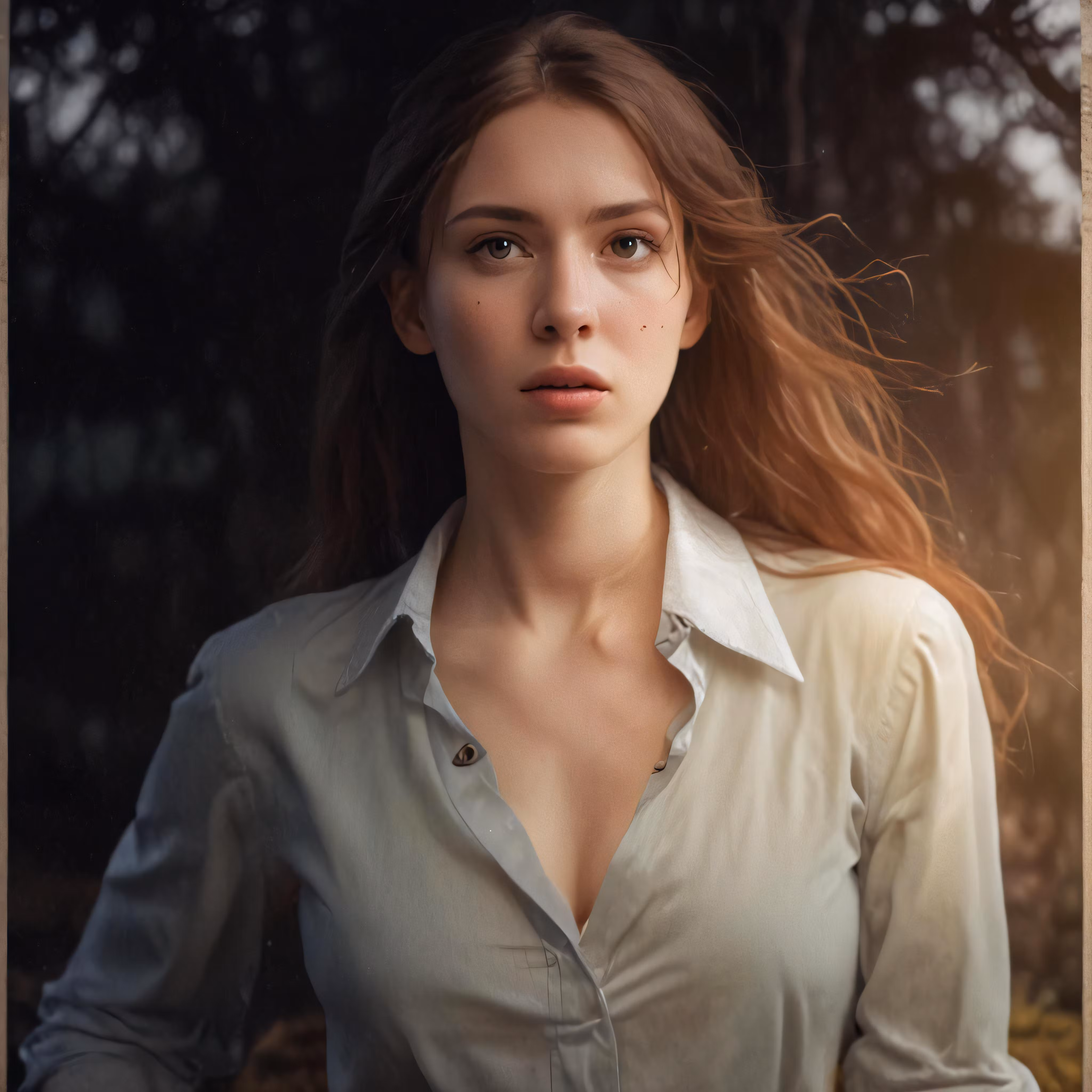 High resolution picture, free to use, a woman is wearing a dress shirt while holding her long hair in one hand and a ponytail