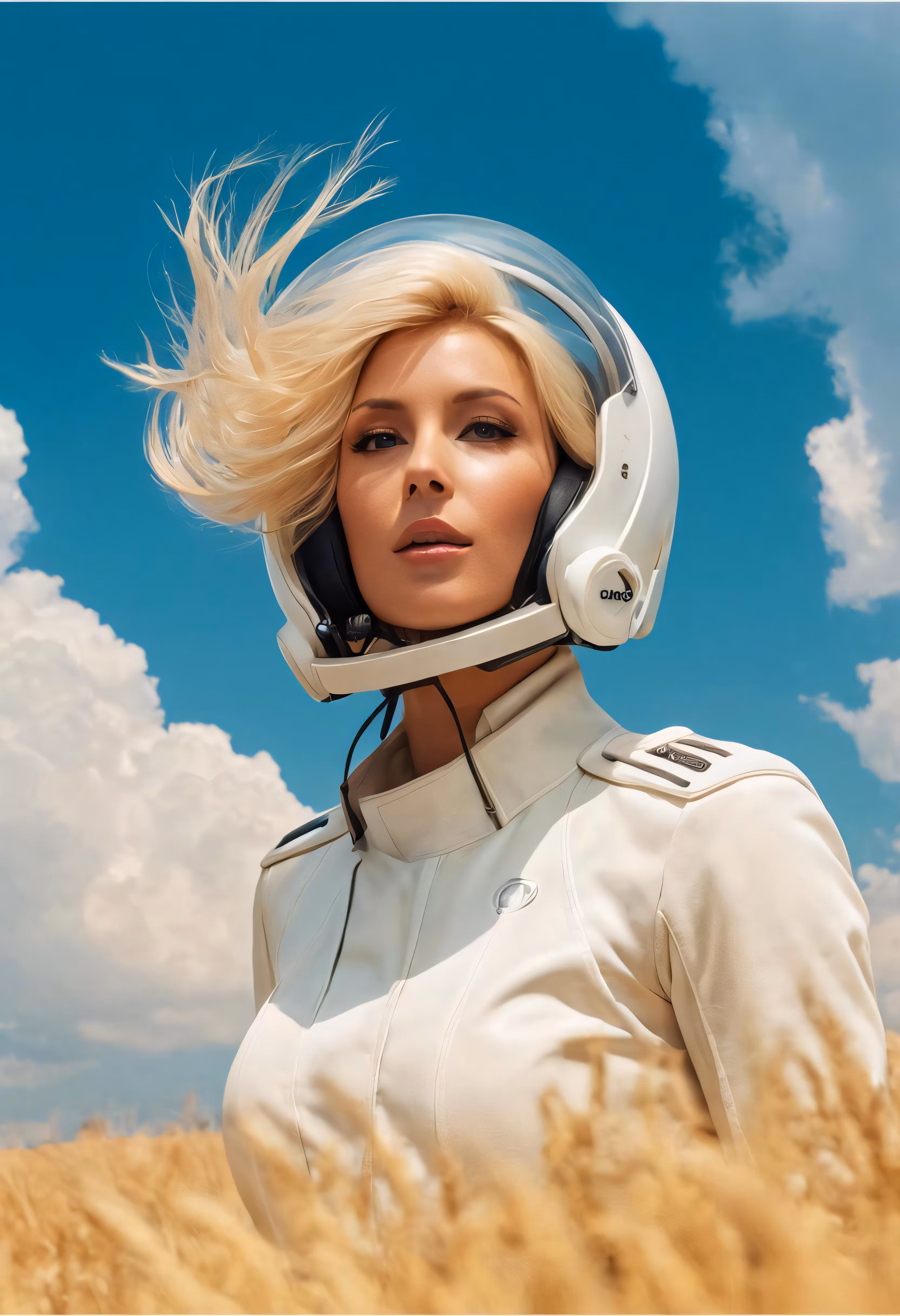 High resolution picture, free to use, a woman is wearing a white helmet with long blonde hair