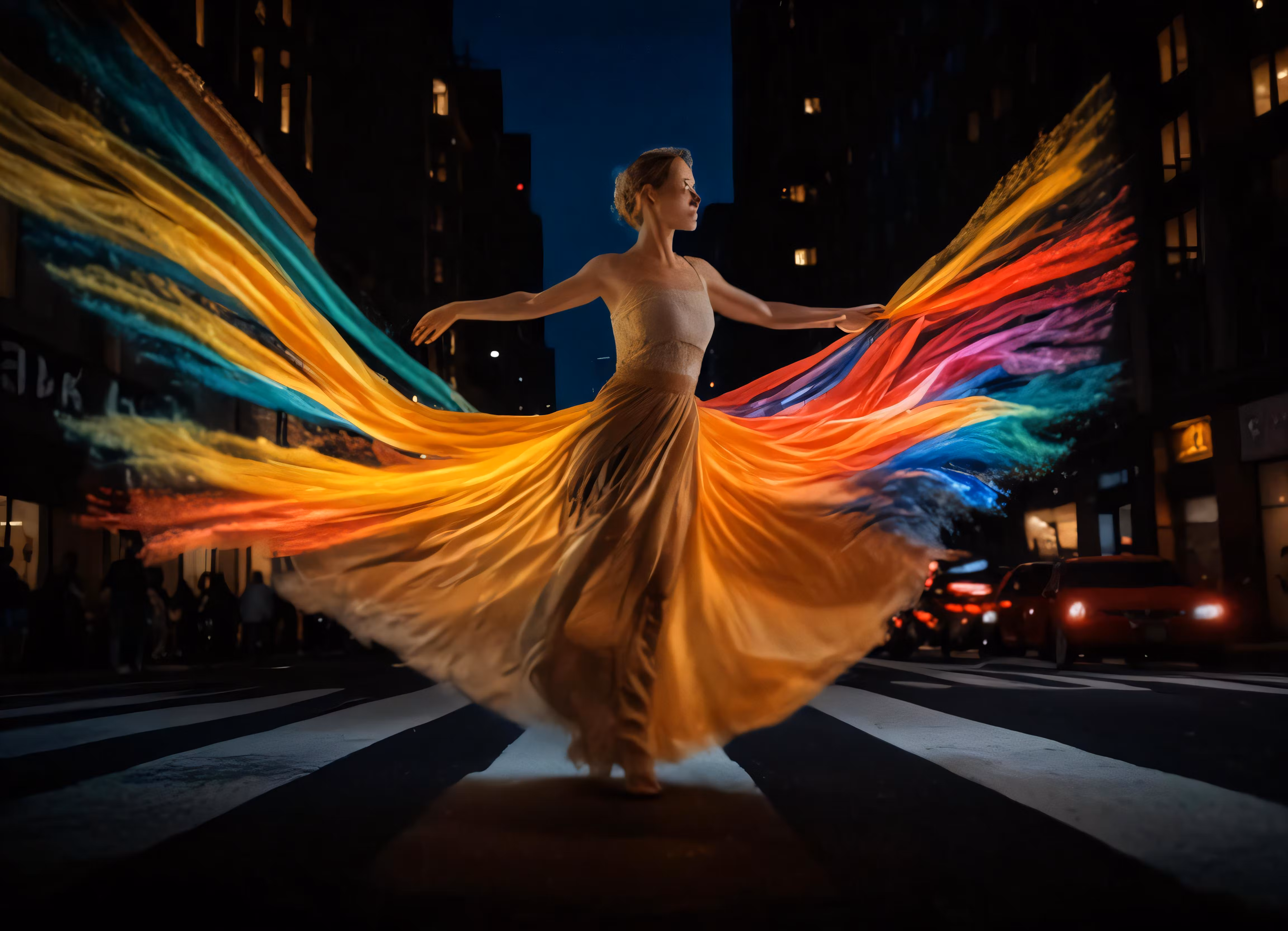 High resolution picture, free to use, a woman is wearing an orange dress and colorful feathers