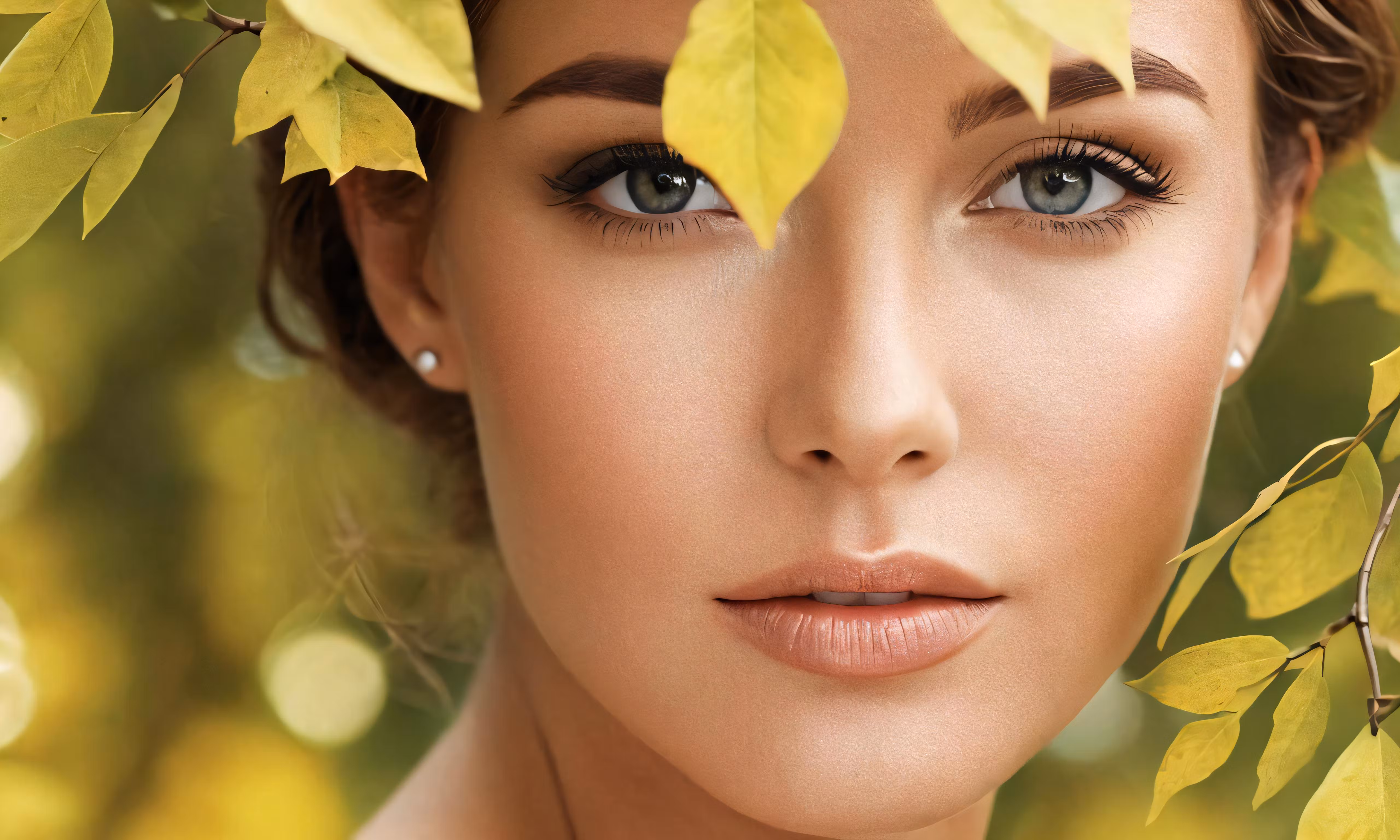 High resolution picture, free to use, a woman is wearing brown makeup and leaves over her face