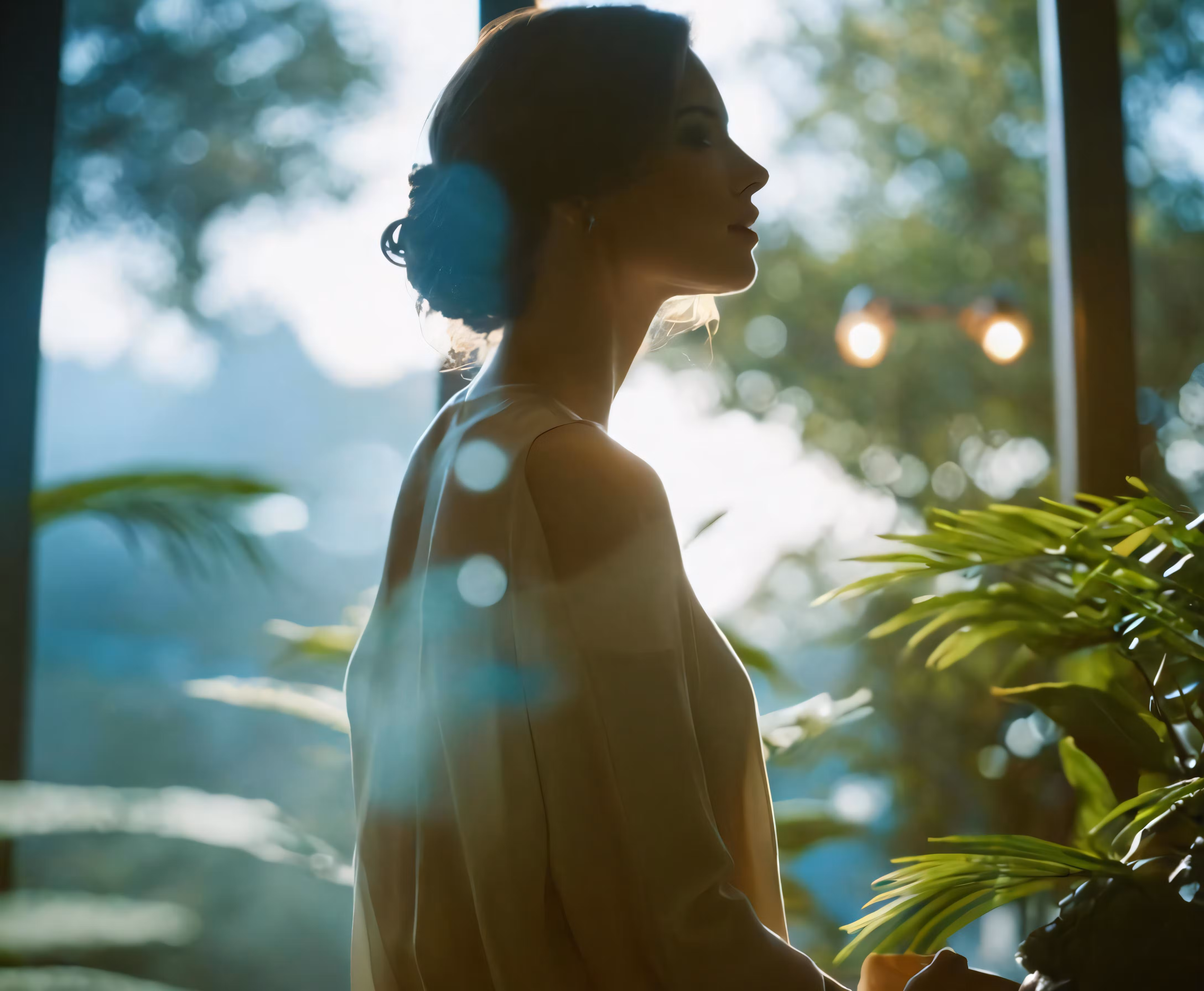 High resolution picture, free to use, a woman is wearing headphones as she sits at the window