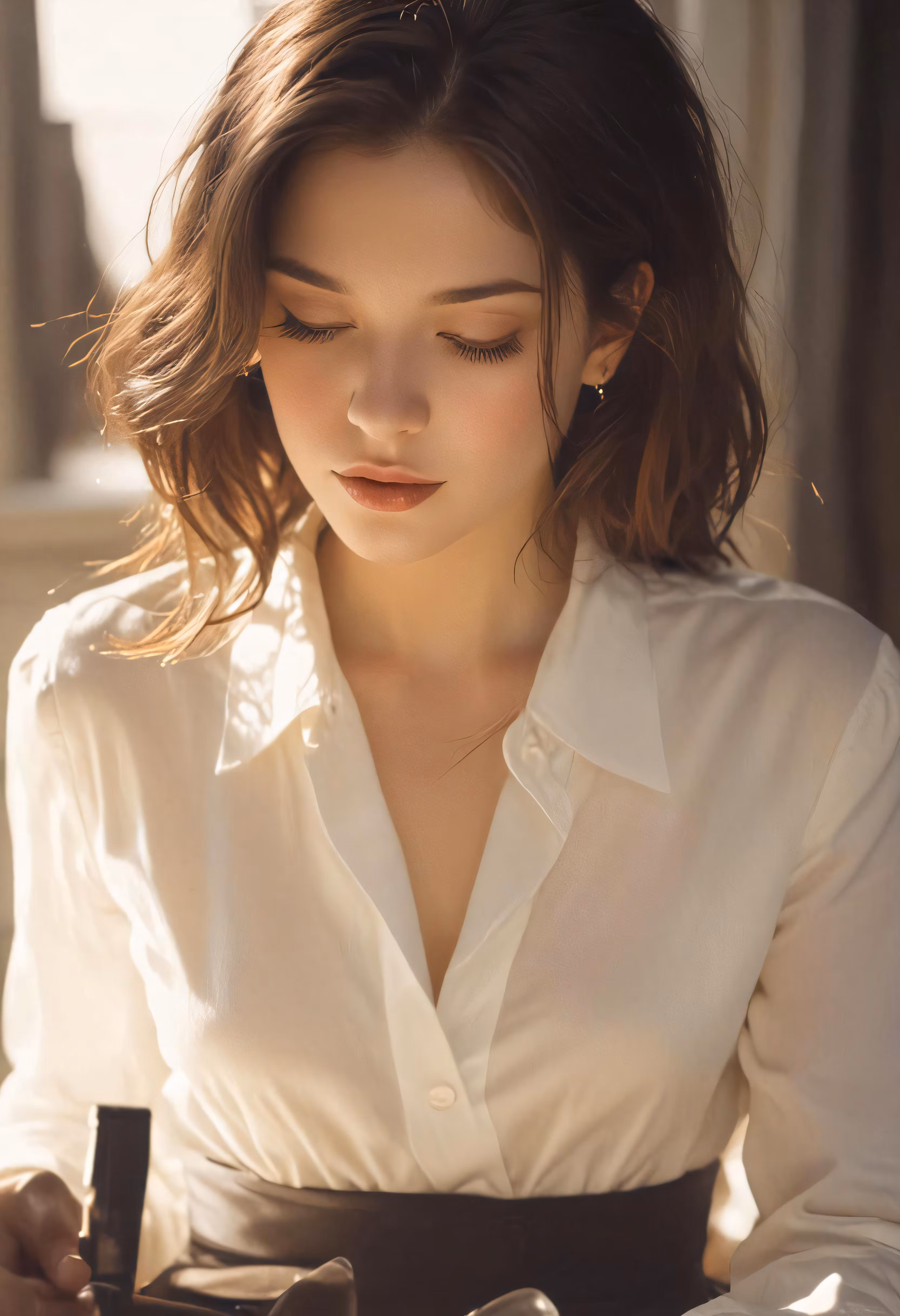 High resolution picture, free to use, a woman is writing something while wearing a white shirt