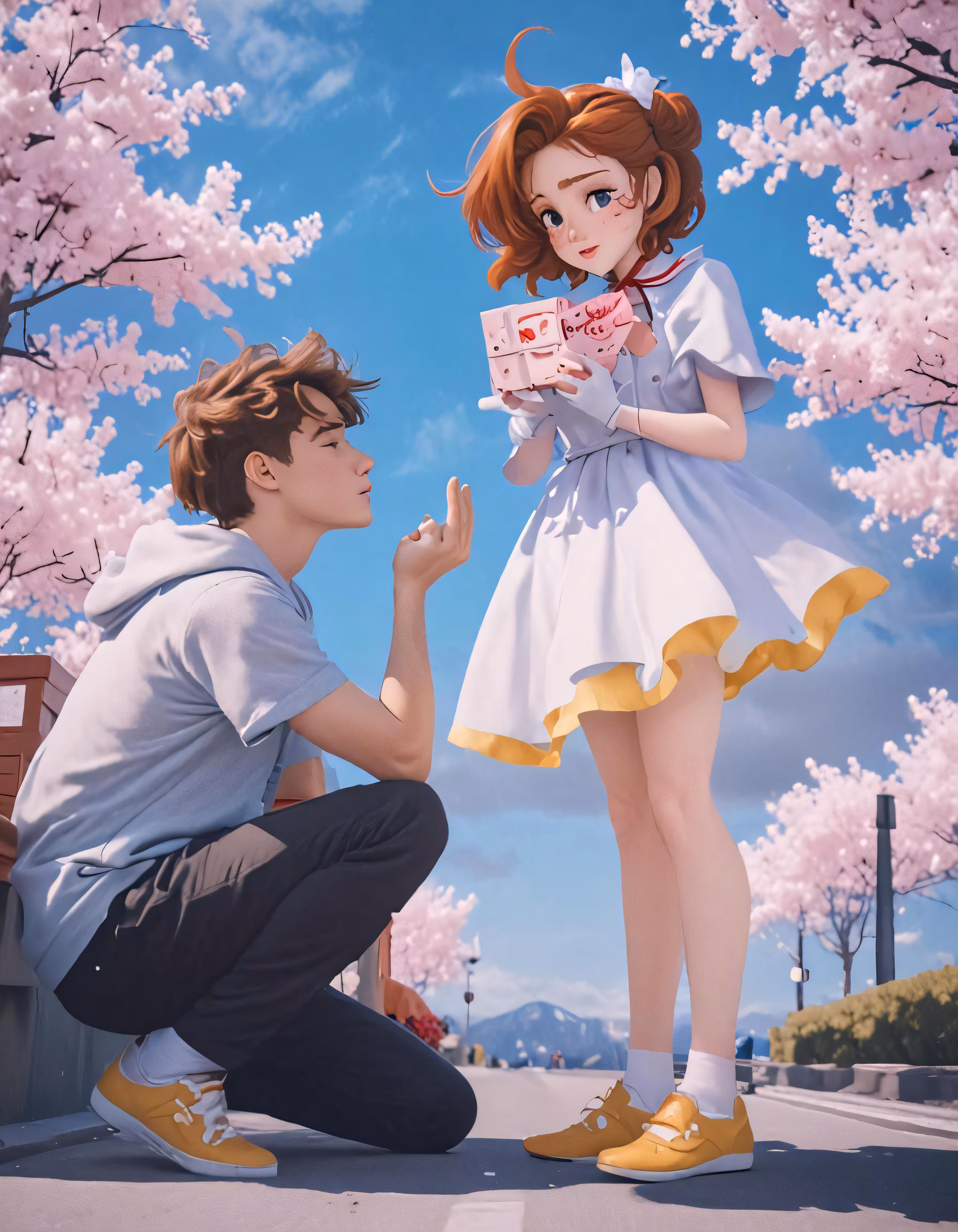 High resolution picture, free to use, a woman kneeling next to a man under cherry trees