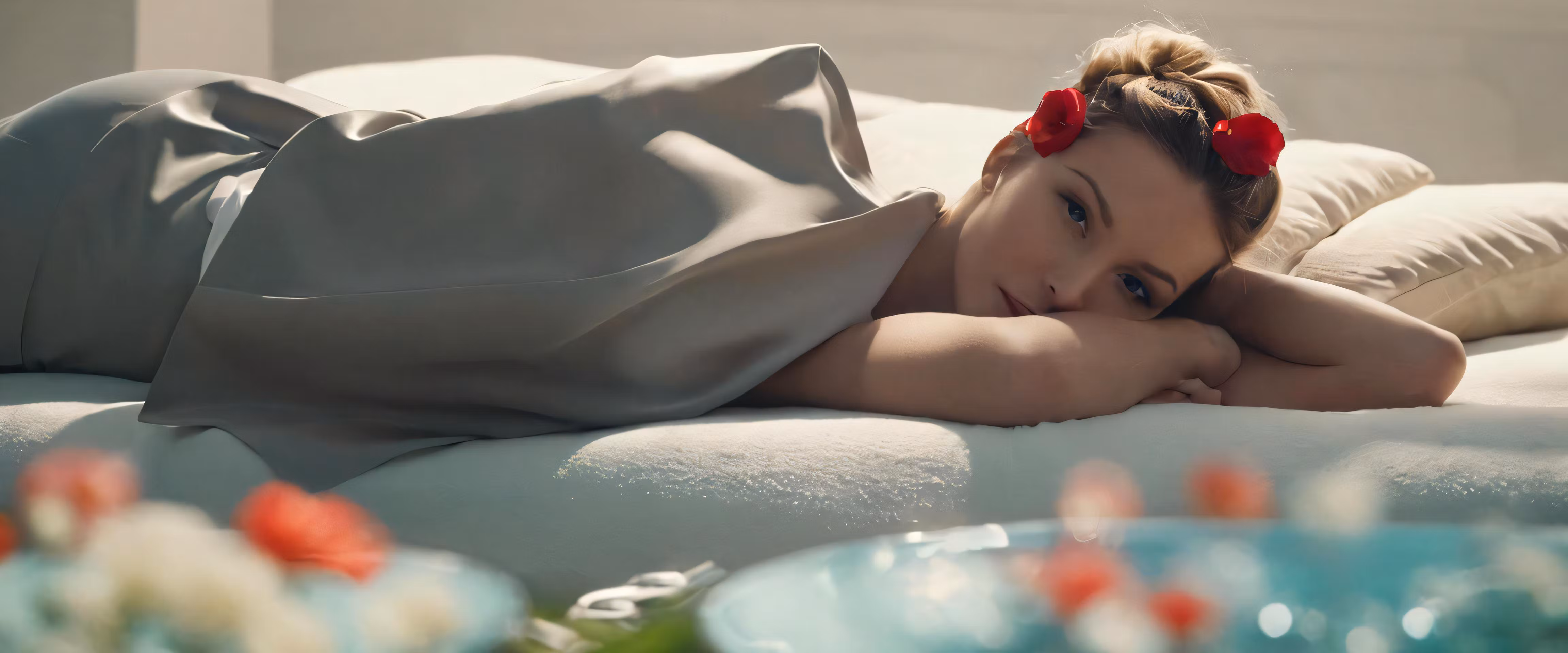 High resolution picture, free to use, a woman lays on her stomach on a bed