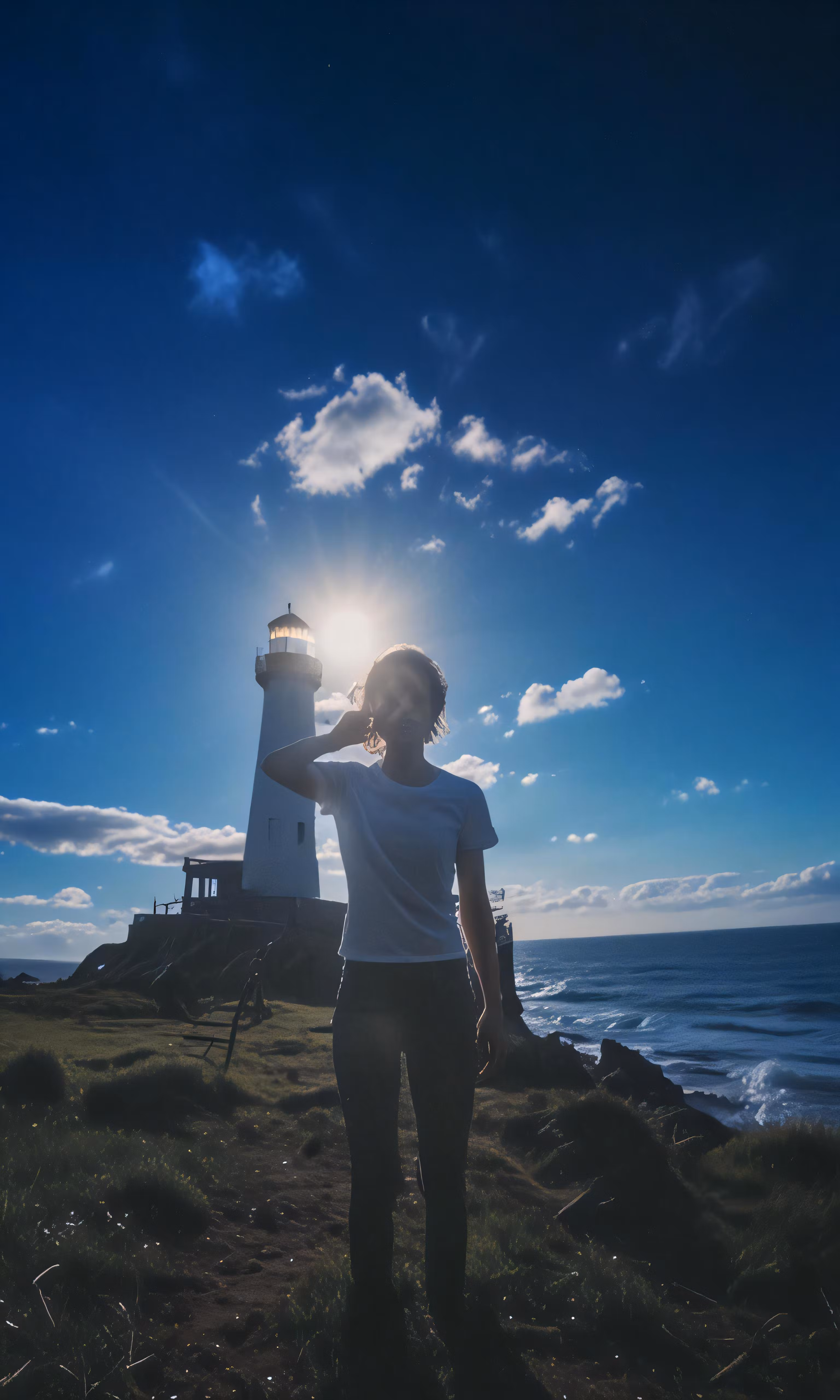 High resolution picture, free to use, a woman looking at a light house near the ocean